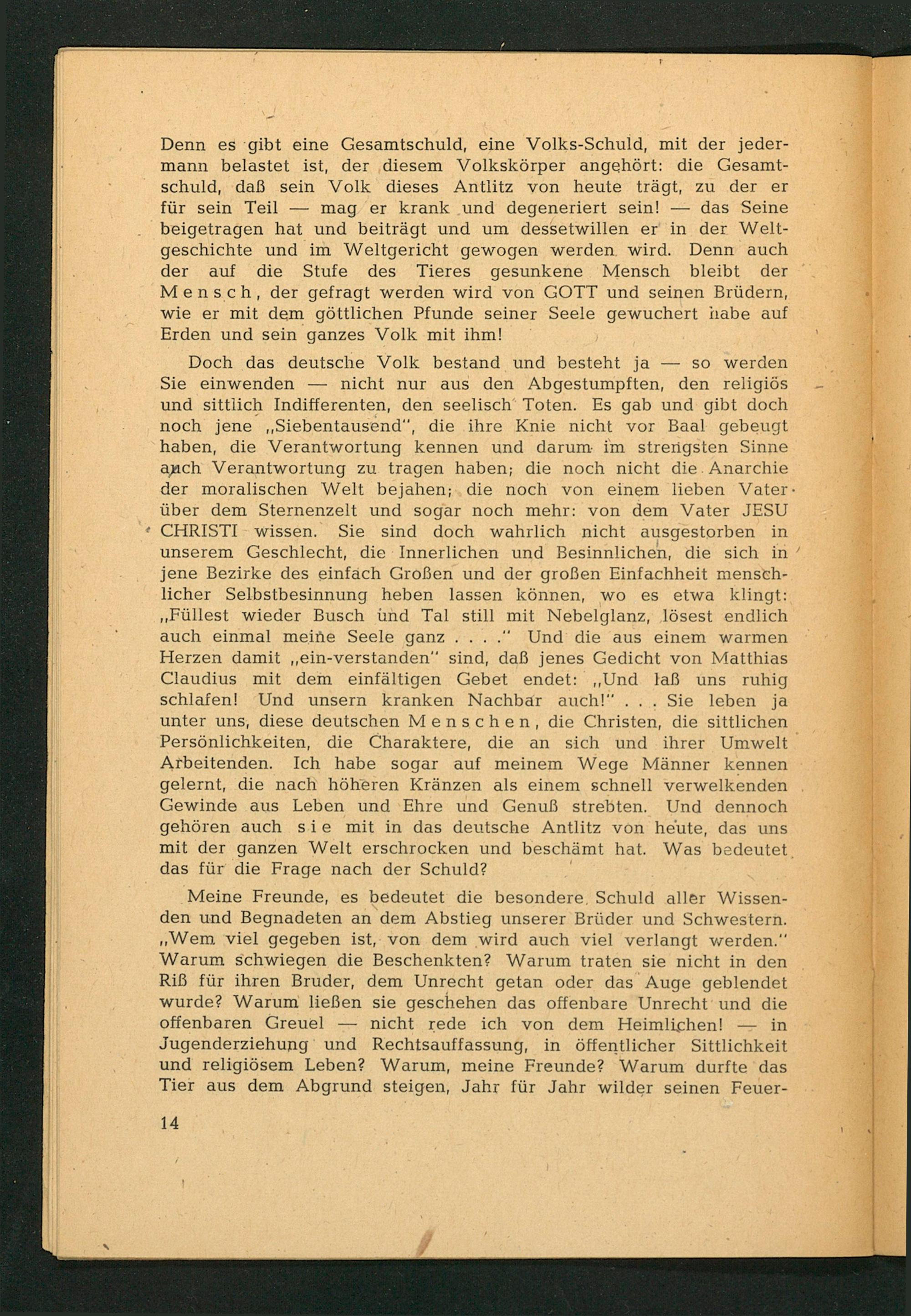 Denn es gibt eine Gesamtschuld, eine Volks- Schuld, mit der jedermann belastet ist, der diesem Volkskörper angehört: die Gesamtschuld, daß sein Volk dieses Antlitz von heute trägt, zu der er für sein Teil mag er krank und degeneriert sein! beigetragen hat und beiträgt und um dessetwillen er in der Weltgeschichte und im Weltgericht gewogen werden wird. Denn auch der auf die Stufe des Tieres gesunkene Mensch bleibt der Mensch, der gefragt werden wird von GOTT und seinen Brüdern, wie er mit dem göttlichen Pfunde seiner Seele gewuchert habe auf Erden und sein ganzes Volk mit ihm!