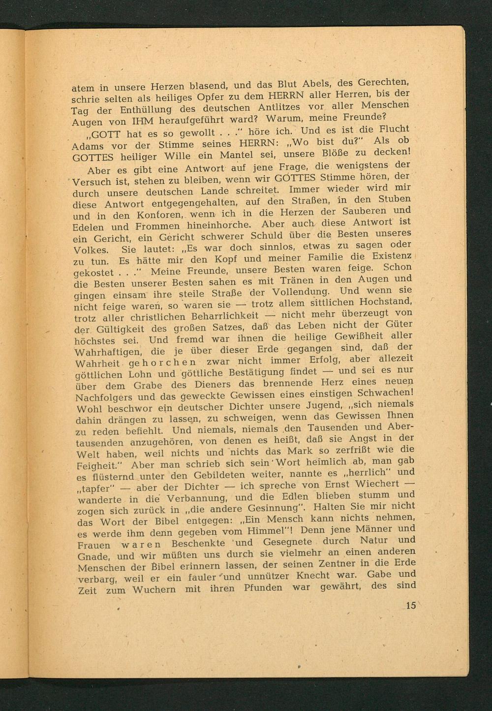 Aber es gibt eine Antwort auf jene Frage, die wenigstens der Versuch ist, stehen zu bleiben, wenn wir GOTTES Stimme hören, der durch unsere deutschen Lande schreitet. Immer wieder wird mir diese Antwort entgegengehalten, auf den Straßen, in den Stuben und in den Kontoren, wenn ich in die Herzen der Sauberen und Edelen und Frommen hineinhorche. Aber auch diese Antwort ist ein Gericht, ein Gericht schwerer Schuld über die Besten unseres Volkes. Sie lautet:„Es war doch sinnlos, etwas zu sagen oder zu tun. Es hätte mir den Kopf und meiner Familie die Existenz gekostet....“ Meine Freunde, unsere Besten waren feige. Schon die Besten unserer Besten sahen es mit Tränen in den Augen und gingen einsam ihre steile Straße der Vollendung. Und wenn sie nicht feige waren, so"waren sie— trotz allem sittlichen Hochstand, trotz aller christlichen Beharrlichkeit— nicht mehr überzeugt von der. Gültigkeit des großen Satzes, daß das Leben nicht der Güter höchstes sei. Und fremd war ihnen die heilige Gewißheit aller Wahrhaftigen, die je über dieser Erde ‘gegangen sind, daß der Wahrheit. gehorchen zwar nicht immer Erfolg, aber allezeit göttlichen Lohn und göttliche Bestätigung findet— und sei es nur über dem Grabe des Dieners das brennende Herz eines neuen Nachfolgers und das geweckte Gewissen eines einstigen Schwachen! Wohl beschwor ein deutscher Dichter unsere Jugend,„sich niemals dahin drängen zu lassen, zu schweigen, wenn das Gewissen Ihnen zu reden befiehlt. Und niemals, niemals ‚den Tausenden und Aber- tausenden anzugehören, von denen es heißt, daß sie Angst in der Welt haben, weil nichts und nichts das Mark so zerfrißt wie die Feigheit.” Aber man schrieb sich sein‘’Wort heimlich ab, man gab es flüsternd unter den Gebildeten weiter, nannte es„herrlich“ und „tapfer— aber der Dichter— ich spreche von Ernst Wiechert — wanderte. in die Verbannung, und die Edlen blieben stumm und zogen sich zurück in„die andere Gesinnung“. Halten Sie mir nicht das Wort der Bibel entgegen:„Ein Mensch kann nichts nehmen, es werde ihm denn gegeben vom Himmel“! Denn jene Männer und Frauen waren Beschenkte'und Gesegnete durch Natur und Gnade, und wir müßten uns durch sie vielmehr an einen anderen Menschen der Bibel erinnern lassen, der seinen Zentner in die Erde