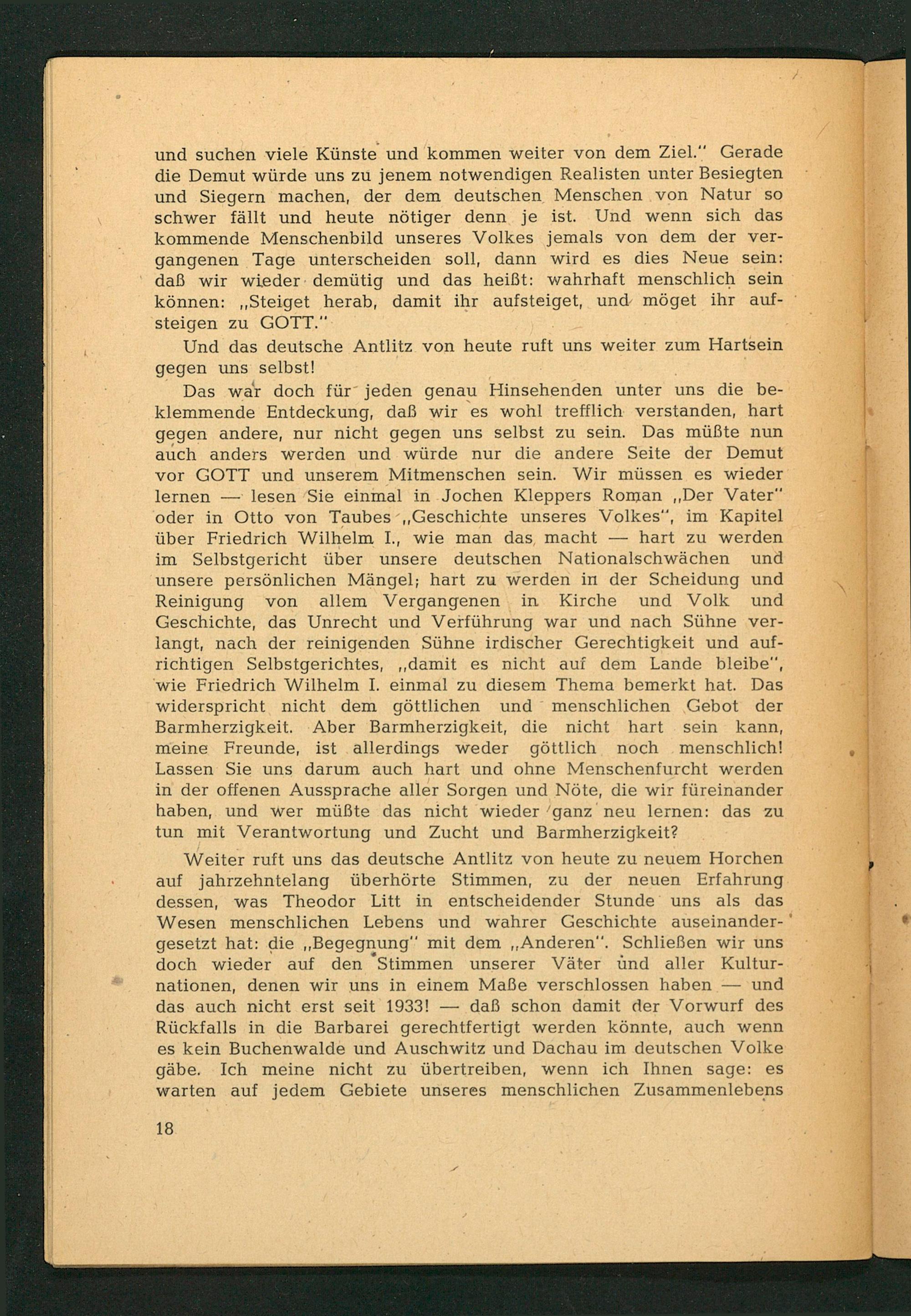 Weiter ruft uns das deutsche Antlitz von heute zu neuem Horchen auf jahrzehntelang überhörte Stimmen, zu der neuen Erfahrung dessen, was Theodor Litt in entscheidender Stunde uns als das Wesen menschlichen Lebens und wahrer Geschichte auseinandergesetzt hat: die ,, Begegnung" mit dem ,, Anderen". Schließen wir uns doch wieder auf den Stimmen unserer Väter und aller Kulturnationen, denen wir uns in einem Maße verschlossen haben und das auch nicht erst seit 1933! daß schon damit der Vorwurf des Rückfalls in die Barbarei gerechtfertigt werden könnte, auch wenn es kein Buchenwalde und Auschwitz und Dachau im deutschen Volke gäbe. Ich meine nicht zu übertreiben, wenn ich Ihnen sage: es warten auf jedem Gebiete unseres menschlichen Zusammenlebens