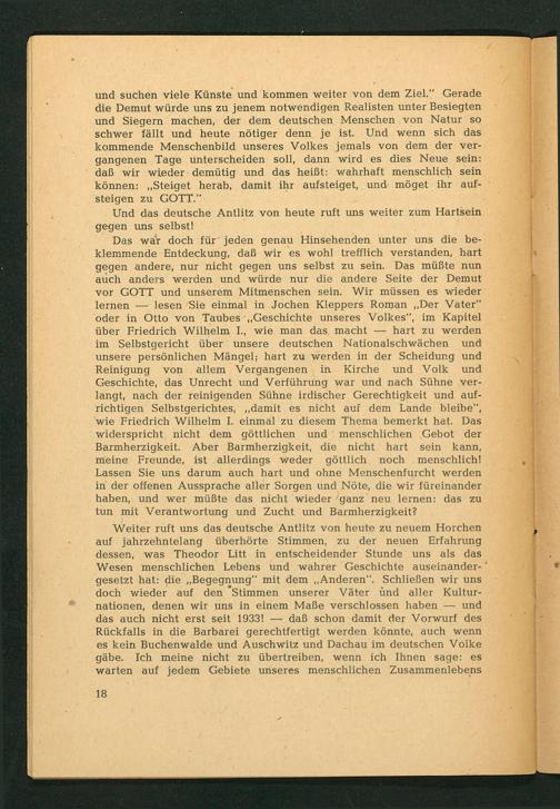 Das war doch für jeden genau Hinsehenden unter uns die beklemmende Entdeckung, daß wir es wohl trefflich verstanden, hart gegen andere, nur nicht gegen uns selbst zu sein. Das müßte nun auch anders werden und würde nur die andere Seite der Demut vor GOTT und unserem Mitmenschen sein. Wir müssen es wieder lernen lesen Sie einmal in Jochen Kleppers Roman ,, Der Vater" oder in Otto von Taubes ,, Geschichte unseres Volkes", im Kapitel über Friedrich Wilhelm I. , wie man das, macht hart zu werden im Selbstgericht über unsere deutschen Nationalschwächen und unsere persönlichen Mängel; hart zu werden in der Scheidung und Reinigung von allem Vergangenen in Kirche und Volk und Geschichte, das Unrecht und Verführung war und nach Sühne verlangt, nach der reinigenden Sühne irdischer Gerechtigkeit und aufrichtigen Selbstgerichtes ,,, damit es nicht auf dem Lande bleibe", wie Friedrich Wilhelm I. einmal zu diesem Thema bemerkt hat. Das widerspricht nicht dem göttlichen und menschlichen Gebot der Barmherzigkeit. Aber Barmherzigkeit, die nicht hart sein kann, meine Freunde, ist allerdings weder göttlich noch menschlich! Lassen Sie uns darum auch hart und ohne Menschenfurcht werden in der offenen Aussprache aller Sorgen und Nöte, die wir füreinander haben, und wer müßte das nicht wieder ganz neu lernen: das zu tun mit Verantwortung und Zucht und Barmherzigkeit?