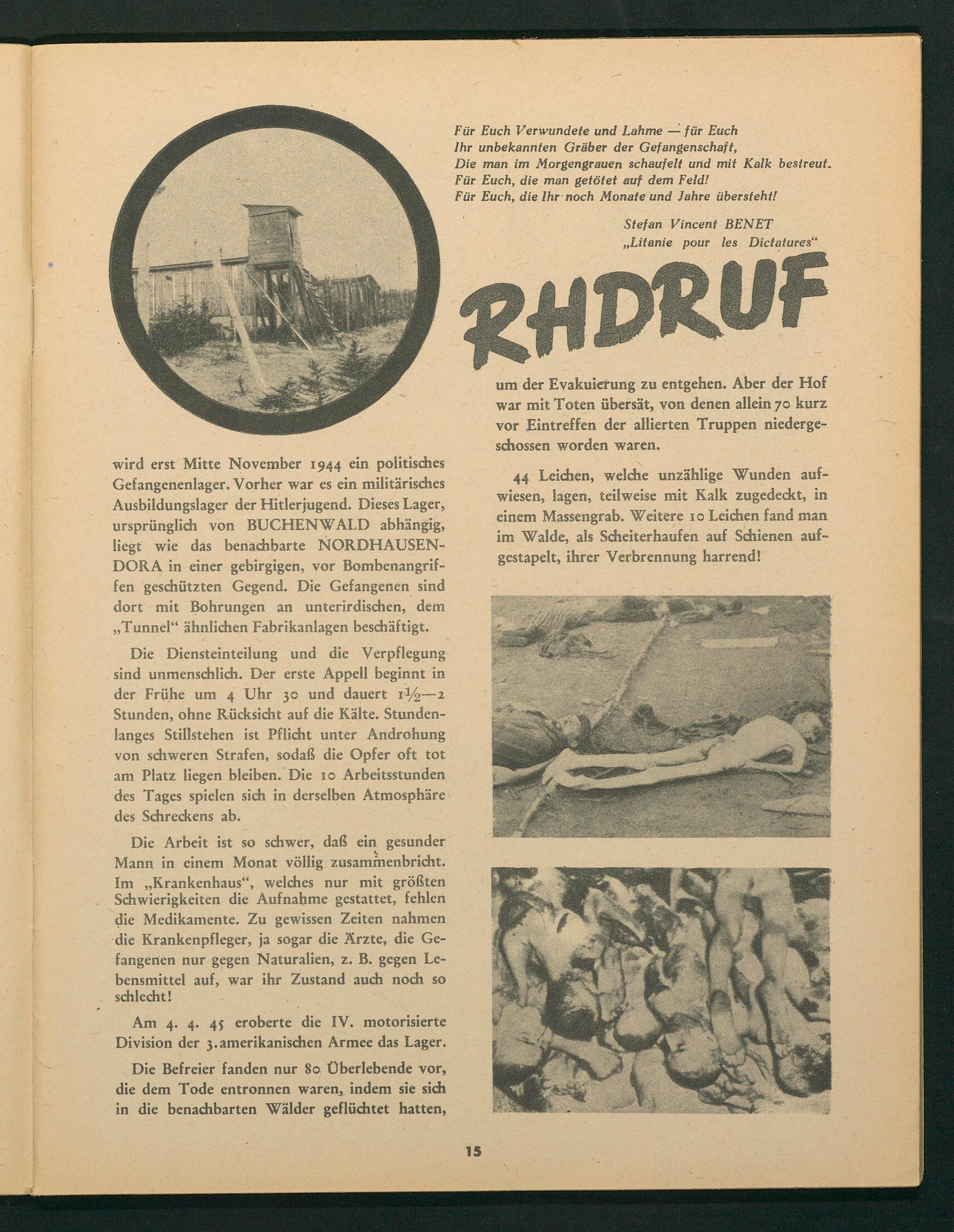 wird erst Mitte November 1944 ein politisches Gefangenenlager. Vorher war es ein militärisches Ausbildungslager der Hitlerjugend . Dieses Lager, ursprünglich von BUCHENWALD abhängig, liegt wie das benachbarte NORDHAUSEN - DORA in einer gebirgigen, vor Bombenangrif- fen geschützten Gegend. Die Gefangenen sind dort mit Bohrungen an unterirdischen, dem „I unnel“ ähnlichen Fabrikanlagen beschäftigt.