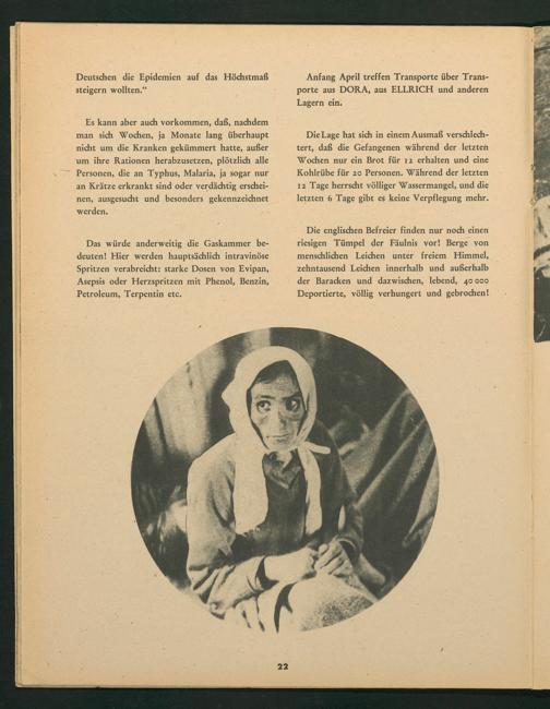 Die englischen Befreier finden nur noch einen riesigen Tümpel der Fäulnis vor! Berge von menschlichen Leichen unter freiem Himmel, zehntausend Leichen innerhalb und außerhalb der Baracken und dazwischen, lebend, 40 000 Deportierte, völlig verhungert und gebrochen!
