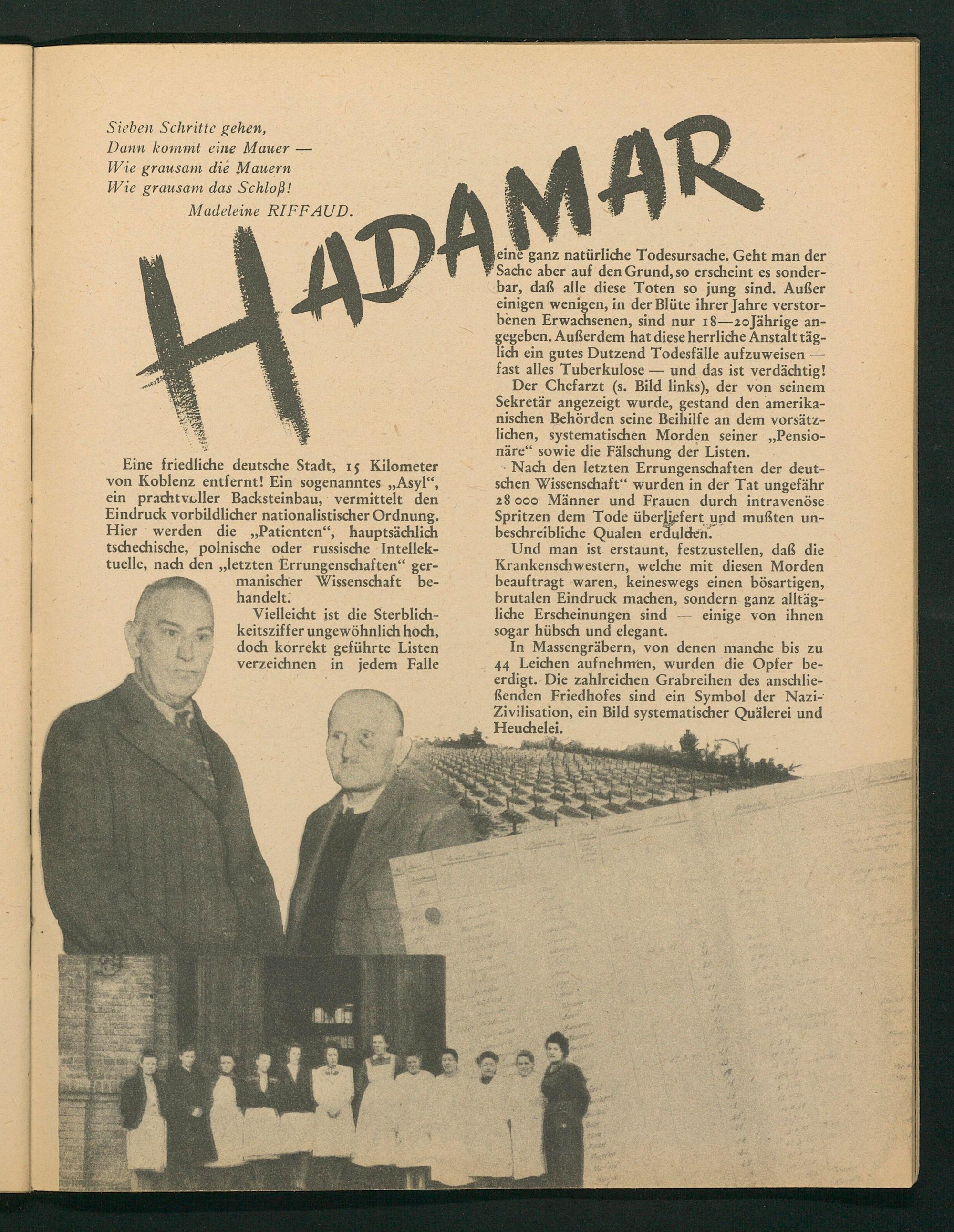 Eine friedliche deutsche Stadt, 15 Kilometer von Koblenz entfernt! Ein sogenanntes ,, Asyl", ein prachtvoller Backsteinbau, vermittelt den Eindruck vorbildlicher nationalistischer Ordnung. Hier werden die„ Patienten", hauptsächlich tschechische, polnische oder russische Intellektuelle, nach den ,, letzten Errungenschaften" germanischer Wissenschaft be