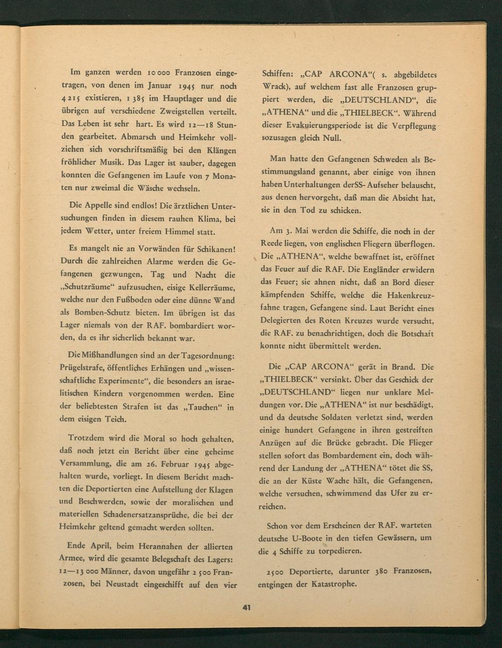 Die„, CAP ARCONA " gerät in Brand. Die ,, THIELBECK" versinkt. Über das Geschick der ,, DEUTSCHLAND " liegen nur unklare Meldungen vor. Die ,, ATHENA" ist nur beschädigt, und da deutsche Soldaten verletzt sind, werden einige hundert Gefangene in ihren gestreiften Anzügen auf die Brücke gebracht. Die Flieger stellen sofort das Bombardement ein, doch während der Landung der ,, ATHENA" tötet die SS, die an der Küste Wache hält, die Gefangenen, welche versuchen, schwimmend das Ufer zu erreichen.