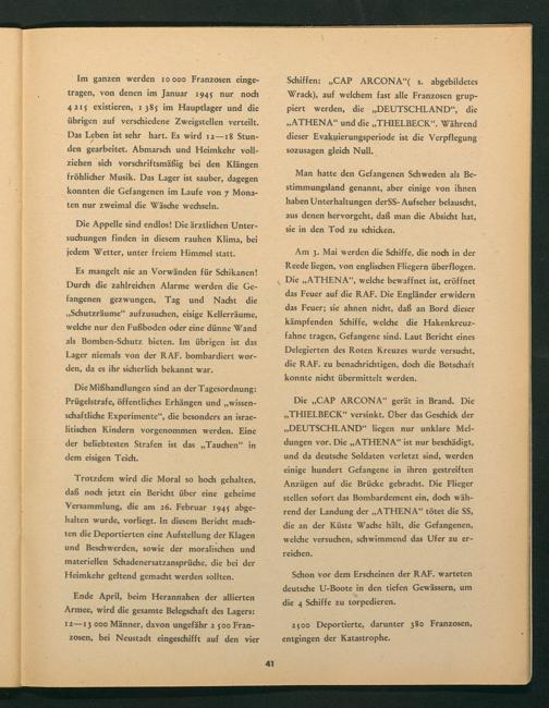 Die„, CAP ARCONA " gerät in Brand. Die ,, THIELBECK" versinkt. Über das Geschick der ,, DEUTSCHLAND " liegen nur unklare Meldungen vor. Die ,, ATHENA" ist nur beschädigt, und da deutsche Soldaten verletzt sind, werden einige hundert Gefangene in ihren gestreiften Anzügen auf die Brücke gebracht. Die Flieger stellen sofort das Bombardement ein, doch während der Landung der ,, ATHENA" tötet die SS, die an der Küste Wache hält, die Gefangenen, welche versuchen, schwimmend das Ufer zu erreichen.