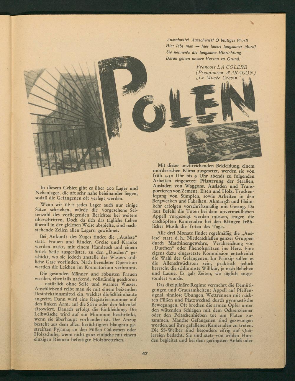 Ausschwitz! Ausschwitz! O blutiges Wort! Hier lebt man hier lauert langsamer Mord! Sie nennen's die langsame Hinrichtung. Daran gehen unsere Herzen zu Grund.