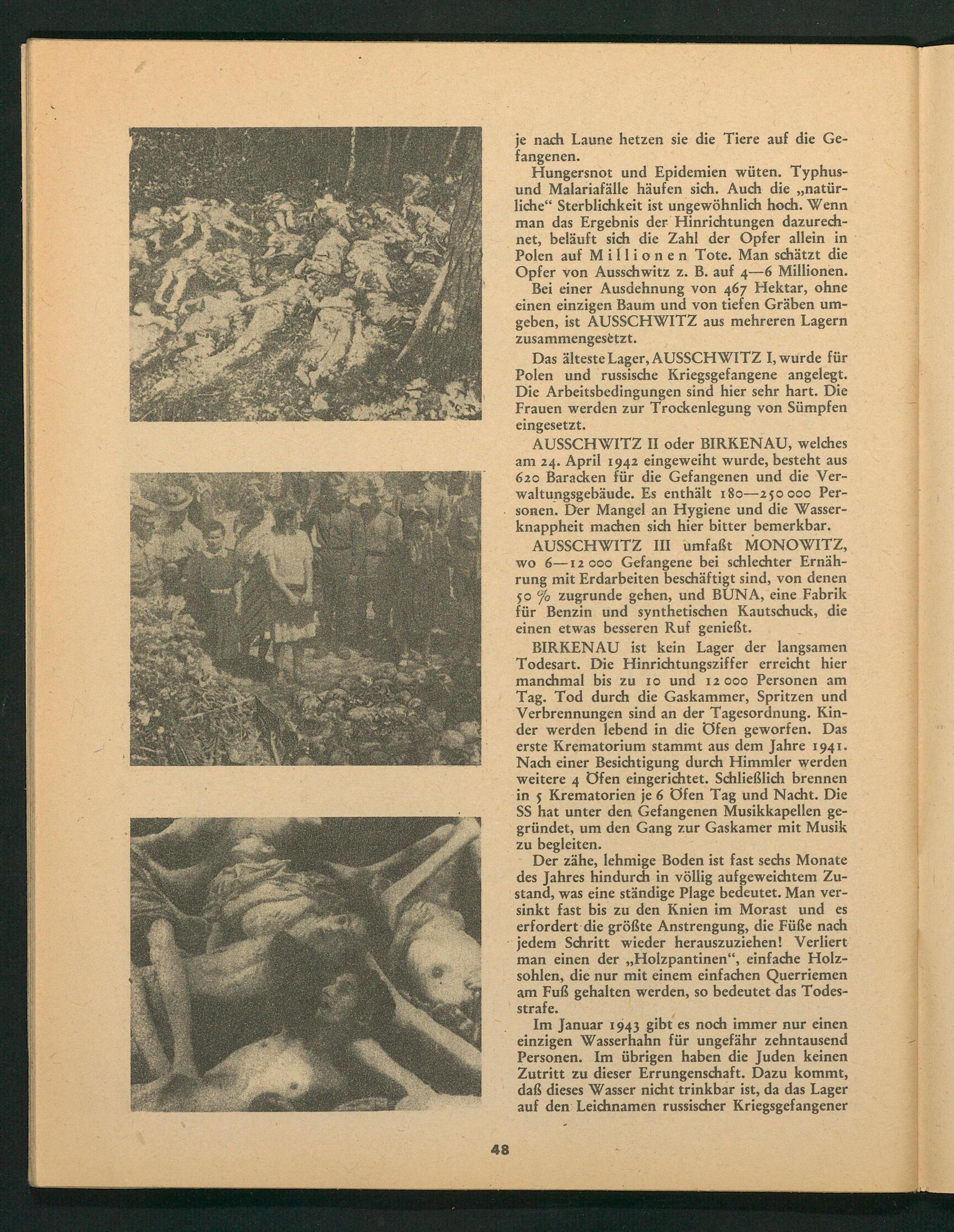 Hungersnot und Epidemien wüten. Typhusund Malariafälle häufen sich. Auch die ,, natürliche" Sterblichkeit ist ungewöhnlich hoch. Wenn man das Ergebnis der Hinrichtungen dazurechnet, beläuft sich die Zahl der Opfer allein in Polen auf Millionen Tote. Man schätzt die Opfer von Ausschwitz z. B. auf 4-6 Millionen.