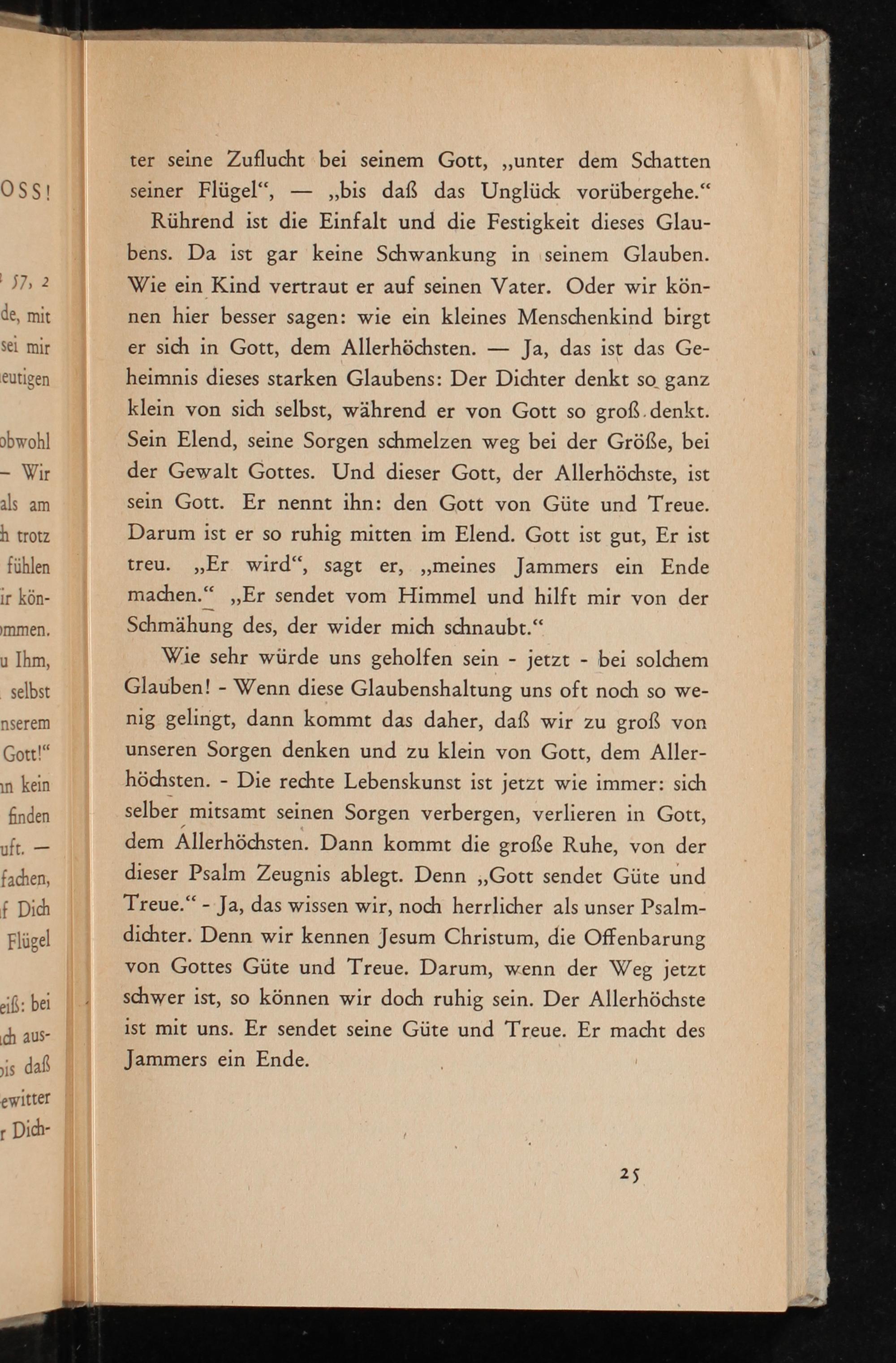 Rührend ist die Einfalt und die Festigkeit dieses Glaubens. Da ist gar keine Schwankung in seinem Glauben. Wie ein Kind vertraut er auf seinen Vater. Oder wir können hier besser sagen: wie ein kleines Menschenkind birgt er sich in Gott, dem Allerhöchsten. Ja, das ist das Geheimnis dieses starken Glaubens: Der Dichter denkt so ganz klein von sich selbst, während er von Gott so groß. denkt. Sein Elend, seine Sorgen schmelzen weg bei der Größe, bei der Gewalt Gottes. Und dieser Gott, der Allerhöchste, ist sein Gott. Er nennt ihn: den Gott von Güte und Treue. Darum ist er so ruhig mitten im Elend. Gott ist gut, Er ist treu. ,, Er wird", sagt er ,,, meines Jammers ein Ende machen." ,, Er sendet vom Himmel und hilft mir von der Schmähung des, der wider mich schnaubt."