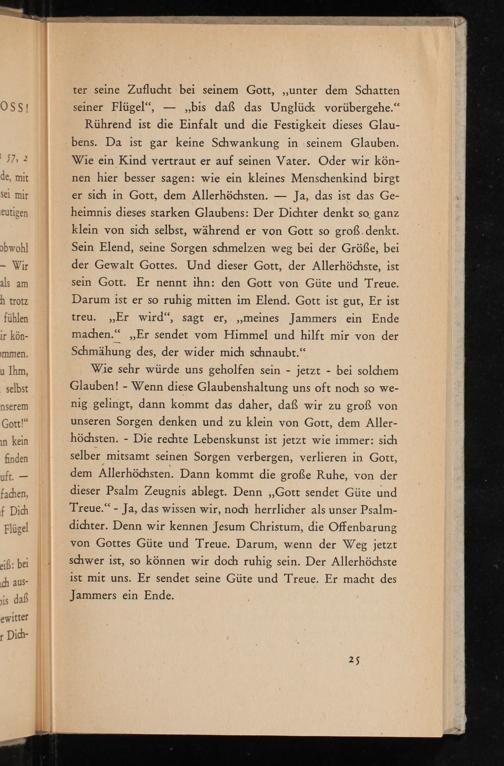 Wie sehr würde uns geholfen sein jetzt bei solchem Glauben! Wenn diese Glaubenshaltung uns oft noch so wenig gelingt, dann kommt das daher, daß wir zu groß von unseren Sorgen denken und zu klein von Gott, dem Allerhöchsten. Die rechte Lebenskunst ist jetzt wie immer: sich selber mitsamt seinen Sorgen verbergen, verlieren in Gott, dem Allerhöchsten. Dann kommt die große Ruhe, von der dieser Psalm Zeugnis ablegt. Denn ,, Gott sendet Güte und Treue."-Ja, das wissen wir, noch herrlicher als unser Psalmdichter. Denn wir kennen Jesum Christum, die Offenbarung von Gottes Güte und Treue. Darum, wenn der Weg jetzt schwer ist, so können wir doch ruhig sein. Der Allerhöchste ist mit uns. Er sendet seine Güte und Treue. Er macht des Jammers ein Ende.