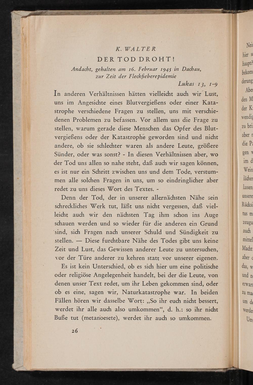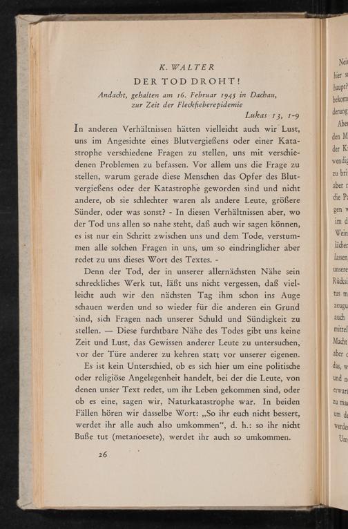 In anderen Verhältnissen hätten vielleicht auch wir Lust, uns im Angesichte eines Blutvergießens oder einer Katastrophe verschiedene Fragen zu stellen, uns mit verschiedenen Problemen zu befassen. Vor allem uns die Frage zu stellen, warum gerade diese Menschen das Opfer des Blutvergießens oder der Katastrophe geworden sind und nicht andere, ob sie schlechter waren als andere Leute, größere Sünder, oder was sonst?- In diesen Verhältnissen aber, wo der Tod uns allen so nahe steht, daß auch wir sagen können, es ist nur ein Schritt zwischen uns und dem Tode, verstummen alle solchen Fragen in uns, um so eindringlicher aber redet zu uns dieses Wort des Textes. -