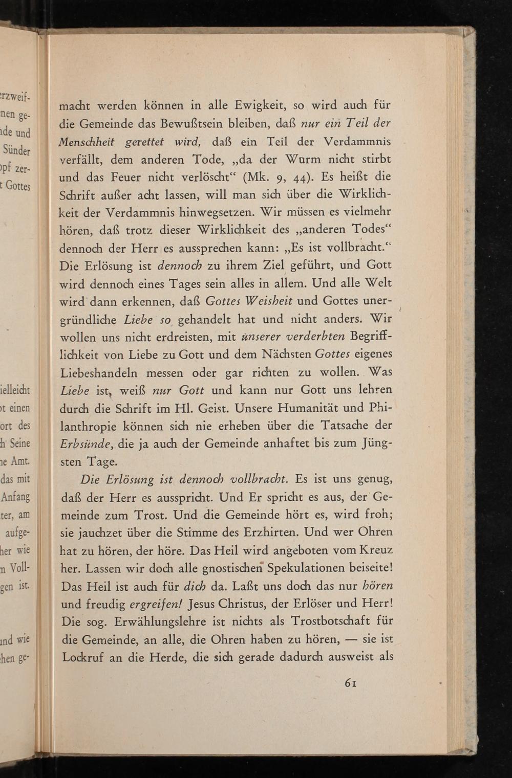 macht werden können in alle Ewigkeit, so wird auch für die Gemeinde das Bewußtsein bleiben, daß nur ein Teil der Menschheit gerettet wird, daß ein Teil der Verdammnis verfällt, dem anderen Tode ,,, da der Wurm nicht stirbt und das Feuer nicht verlöscht"( Mk. 9, 44). Es heißt die Schrift außer acht lassen, will man sich über die Wirklichkeit der Verdammnis hinwegsetzen. Wir müssen es vielmehr hören, daß trotz dieser Wirklichkeit des ,, anderen Todes" dennoch der Herr es aussprechen kann: ,, Es ist vollbracht." Die Erlösung ist dennoch zu ihrem Ziel geführt, und Gott wird dennoch eines Tages sein alles in allem. Und alle Welt wird dann erkennen, daß Gottes Weisheit und Gottes unergründliche Liebe so gehandelt hat und nicht anders. Wir wollen uns nicht erdreisten, mit unserer verderbten Begrifflichkeit von Liebe zu Gott und dem Nächsten Gottes eigenes Liebeshandeln messen oder gar richten zu wollen. Was Liebe ist, weiß nur Gott und kann nur Gott uns lehren durch die Schrift im Hl. Geist. Unsere Humanität und Philanthropie können sich nie erheben über die Tatsache der Erbsünde, die ja auch der Gemeinde anhaftet bis zum Jüngsten Tage.