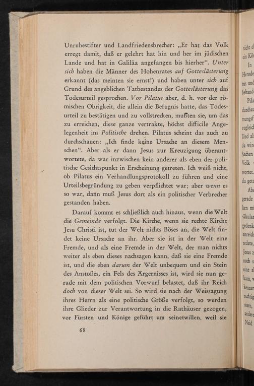 Unruhestifter und Landfriedensbrecher: ,, Er hat das Volk erregt damit, daß er gelehrt hat hin und her im jüdischen Lande und hat in Galiläa angefangen bis hierher". Unter sich haben die Männer des Hohenrates auf Gotteslästerung erkannt( das meinten sie ernst!) und haben unter sich auf Grund des angeblichen Tatbestandes der Gotteslästerung das Todesurteil gesprochen. Vor Pilatus aber, d. h. vor der römischen Obrigkeit, die allein die Befugnis hatte, das Todesurteil zu bestätigen und zu vollstrecken, mußten sie, um das zu erreichen, diese ganze vertrakte, höchst difficile Angelegenheit ins Politische drehen. Pilatus scheint das auch zu durchschauen:„ Ich finde keine Ursache an diesem Menschen". Aber als er dann Jesus zur Kreuzigung überantwortete, da war inzwischen kein anderer als eben der politische Gesichtspunkt in Erscheinung getreten. Ich weiß nicht, ob Pilatus ein Verhandlungsprotokoll zu führen und eine Urteilsbegründung zu geben verpflichtet war; aber wenn es so war, dann muß Jesus dort als ein politischer Verbrecher gestanden haben.