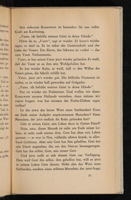 ,, Vater, ich befehle meinen Geist in deine Hände." Das ist wieder ein Psalmwort. Und wollen wir dieses Kreuzwort unseres Heilands verstehen, dann müssen wir zuerst fragen: was hat einstens der Psalm- Dichter sagen wollen?