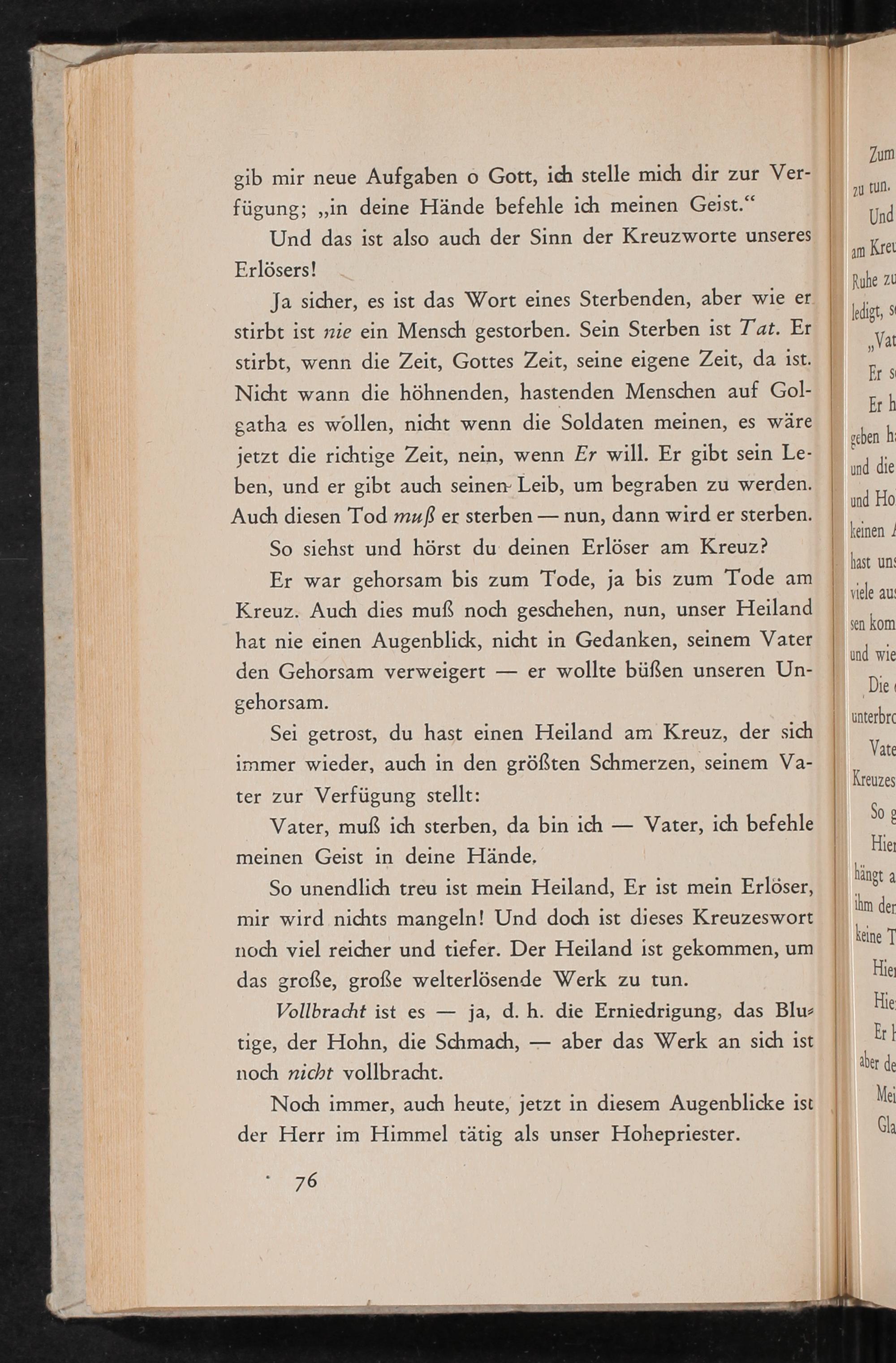 Ja sicher, es ist das Wort eines Sterbenden, aber wie er stirbt ist nie ein Mensch gestorben. Sein Sterben ist Tat. Er stirbt, wenn die Zeit, Gottes Zeit, seine eigene Zeit, da ist. Nicht wann die höhnenden, hastenden Menschen auf Golgatha es wollen, nicht wenn die Soldaten meinen, es wäre jetzt die richtige Zeit, nein, wenn Er will. Er gibt sein Leben, und er gibt auch seinen Leib, um begraben zu werden. Auch diesen Tod muß er sterben- nun, dann wird er sterben. So siehst und hörst du deinen Erlöser am Kreuz? Er war gehorsam bis zum Tode, ja bis zum Tode am Kreuz. Auch dies muß noch geschehen, nun, unser Heiland hat nie einen Augenblick, nicht in Gedanken, seinem Vater den Gehorsam verweigert er wollte büßen unseren Ungehorsam.