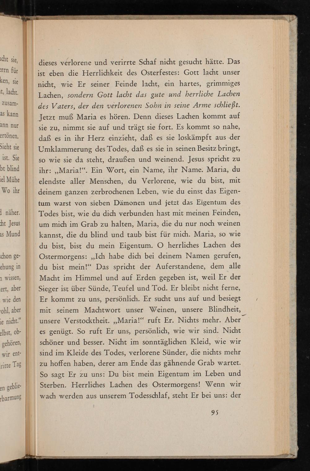dieses verlorene und verirrte Schaf nicht gesucht hätte. Das ist eben die Herrlichkeit des Osterfestes: Gott lacht unser nicht, wie Er seiner Feinde lacht, ein hartes, grimmiges Lachen, sondern Gott lacht das gute und herrliche Lachen des Vaters, der den verlorenen Sohn in seine Arme schließt. Jetzt muß Maria es hören. Denn dieses Lachen kommt auf sie zu, nimmt sie auf und trägt sie fort. Es kommt so nahe, daß es in ihr Herz einzieht, daß es sie loskämpft aus der Umklammerung des Todes, daß es sie in seinen Besitz bringt, so wie sie da steht, draußen und weinend. Jesus spricht zu ihr: ,, Maria!". Ein Wort, ein Name, ihr Name. Maria, du elendste aller Menschen, du Verlorene, wie du bist, mit deinem ganzen zerbrochenen Leben, wie du einst das Eigentum warst von sieben Dämonen und jetzt das Eigentum des Todes bist, wie du dich verbunden hast mit meinen Feinden, um mich im Grab zu halten, Maria, die du nur noch weinen kannst, die du blind und taub bist für mich. Maria, so wie du bist, bist du mein Eigentum. O herrliches Lachen des Ostermorgens: ,, Ich habe dich bei deinem Namen gerufen, du bist mein!" Das spricht der Auferstandene, dem alle Macht im Himmel und auf Erden gegeben ist, weil Er der Sieger ist über Sünde, Teufel und Tod. Er bleibt nicht ferne, Er kommt zu uns, persönlich. Er sucht uns auf und besiegt mit seinem Machtwort unser Weinen, unsere Blindheit, unsere Verstocktheit. ,, Maria!" ruft Er. Nichts mehr. Aber es genügt. So ruft Er uns, persönlich, wie wir sind. Nicht schöner und besser. Nicht im sonntäglichen Kleid, wie wir sind im Kleide des Todes, verlorene Sünder, die nichts mehr zu hoffen haben, derer am Ende das gähnende Grab wartet. So sagt Er zu uns: Du bist mein Eigentum im Leben und Sterben. Herrliches Lachen des Ostermorgens! Wenn wir wach werden aus unserem Todesschlaf, steht Er bei uns: der