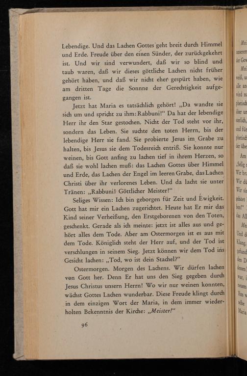 Ostermorgen. Morgen des Lachens. Wir dürfen lachen von Gott her. Denn Er hat uns den Sieg gegeben durch Jesus Christus unsern Herrn! Wo wir nur weinen konnten, wächst Gottes Lachen wunderbar. Diese Freude klingt durch in dem einzigen Wort der Maria, in dem immer wiederholten Bekenntnis der Kirche: ,, Meister!"