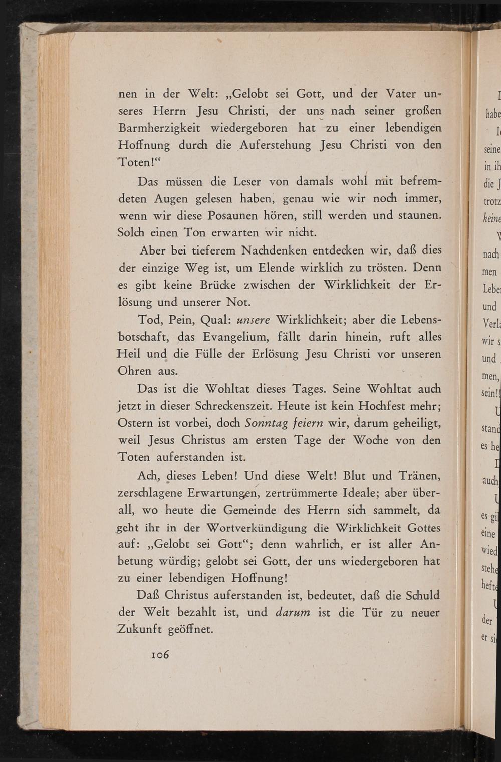 Ach, dieses Leben! Und diese Welt! Blut und Tränen, zerschlagene Erwartungen, zertrümmerte Ideale; aber überall, wo heute die Gemeinde des Herrn sich sammelt, da geht ihr in der Wortverkündigung die Wirklichkeit Gottes auf: ,, Gelobt sei Gott "; denn wahrlich, er ist aller Anbetung würdig; gelobt sei Gott , der uns wiedergeboren hat zu einer lebendigen Hoffnung!