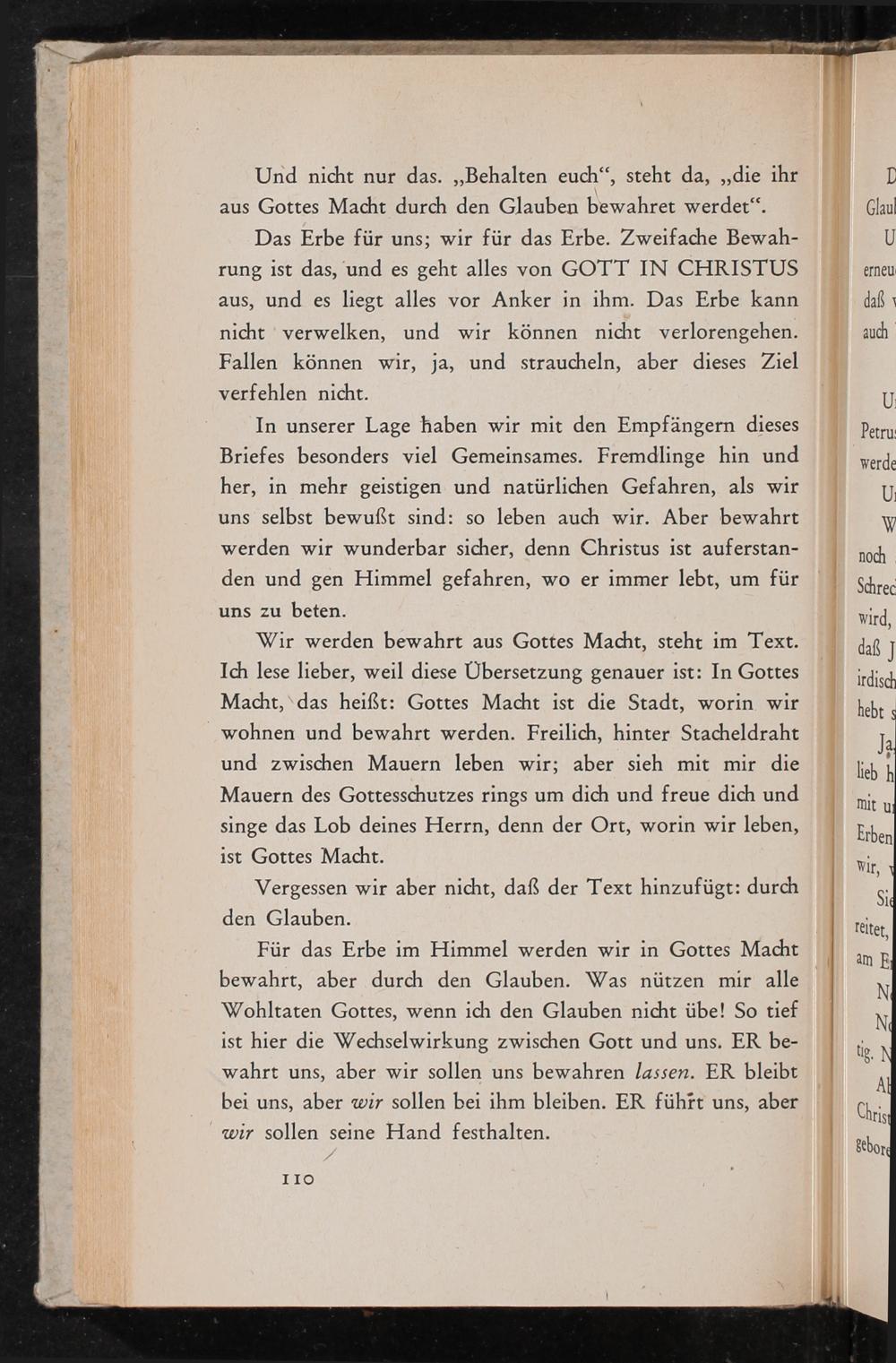 Wir werden bewahrt aus Gottes Macht, steht im Text. Ich lese lieber, weil diese Übersetzung genauer ist: In Gottes Macht,‘das heißt: Gottes Macht ist die Stadt, worin wir wohnen und bewahrt werden. Freilich, hinter Stacheldraht und zwischen Mauern leben wir; aber sieh mit mir die Mauern des Gottesschutzes rings um dich und freue dich und singe das Lob deines Herrn, denn der Ort, worin wir leben, ist Gottes Macht.