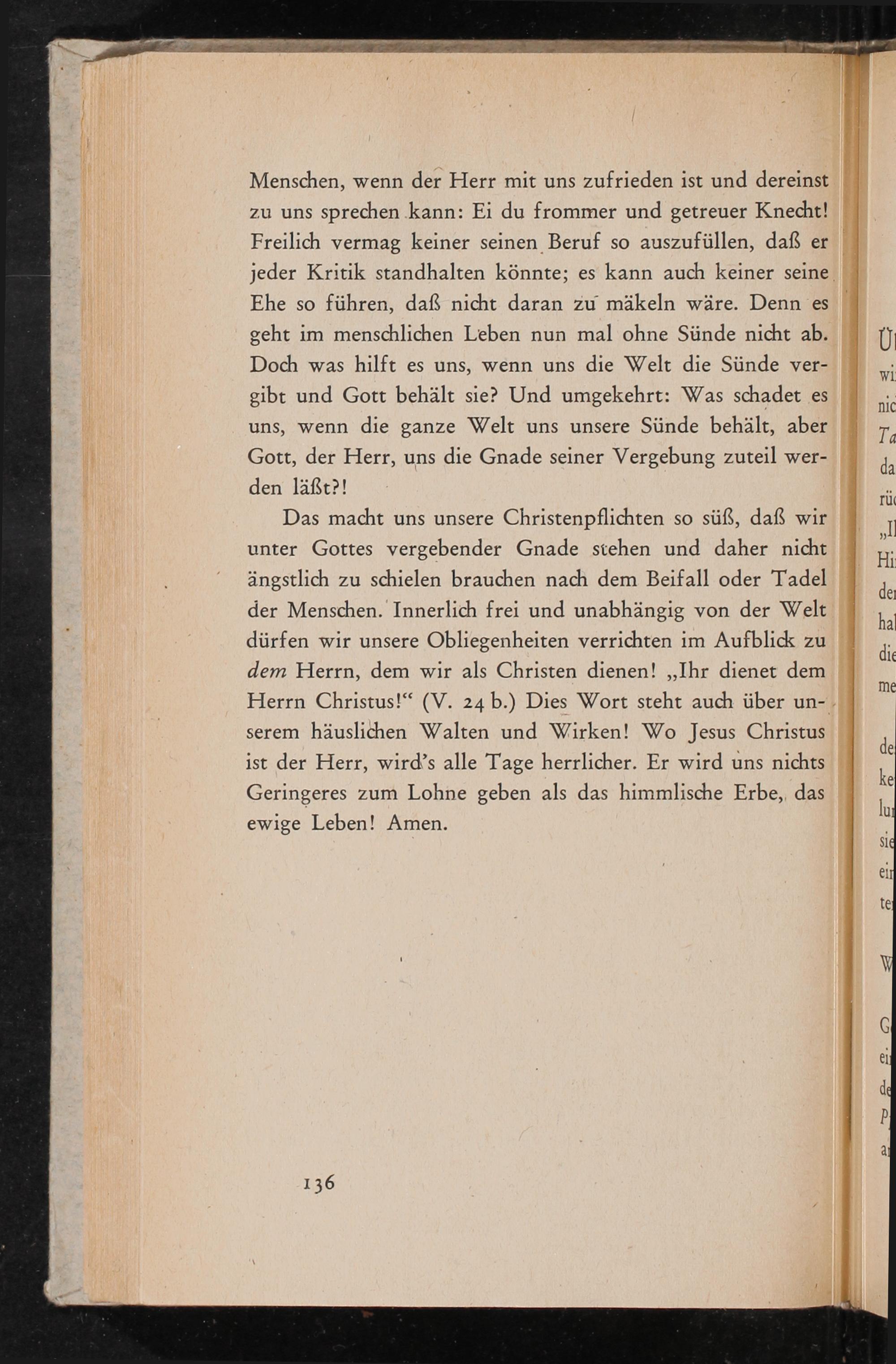 Menschen, wenn der Herr mit uns zufrieden ist und dereinst zu uns sprechen kann: Ei du frommer und getreuer Knecht! Freilich vermag keiner seinen Beruf so auszufüllen, daß er| jeder Kritik standhalten könnte; es kann auch keiner seine. Ehe so führen, daß nicht daran zu mäkeln wäre. Denn es geht im menschlichen Leben nun mal ohne Sünde nicht ab. Doch was hilft es uns, wenn uns die Welt die Sünde ver- gibt und Gott behält sie? Und umgekehrt: Was schadet es uns, wenn die ganze Welt uns unsere Sünde behält, aber Gott , der Herr, uns die Gnade seiner Vergebung zuteil wer- den läßt?!