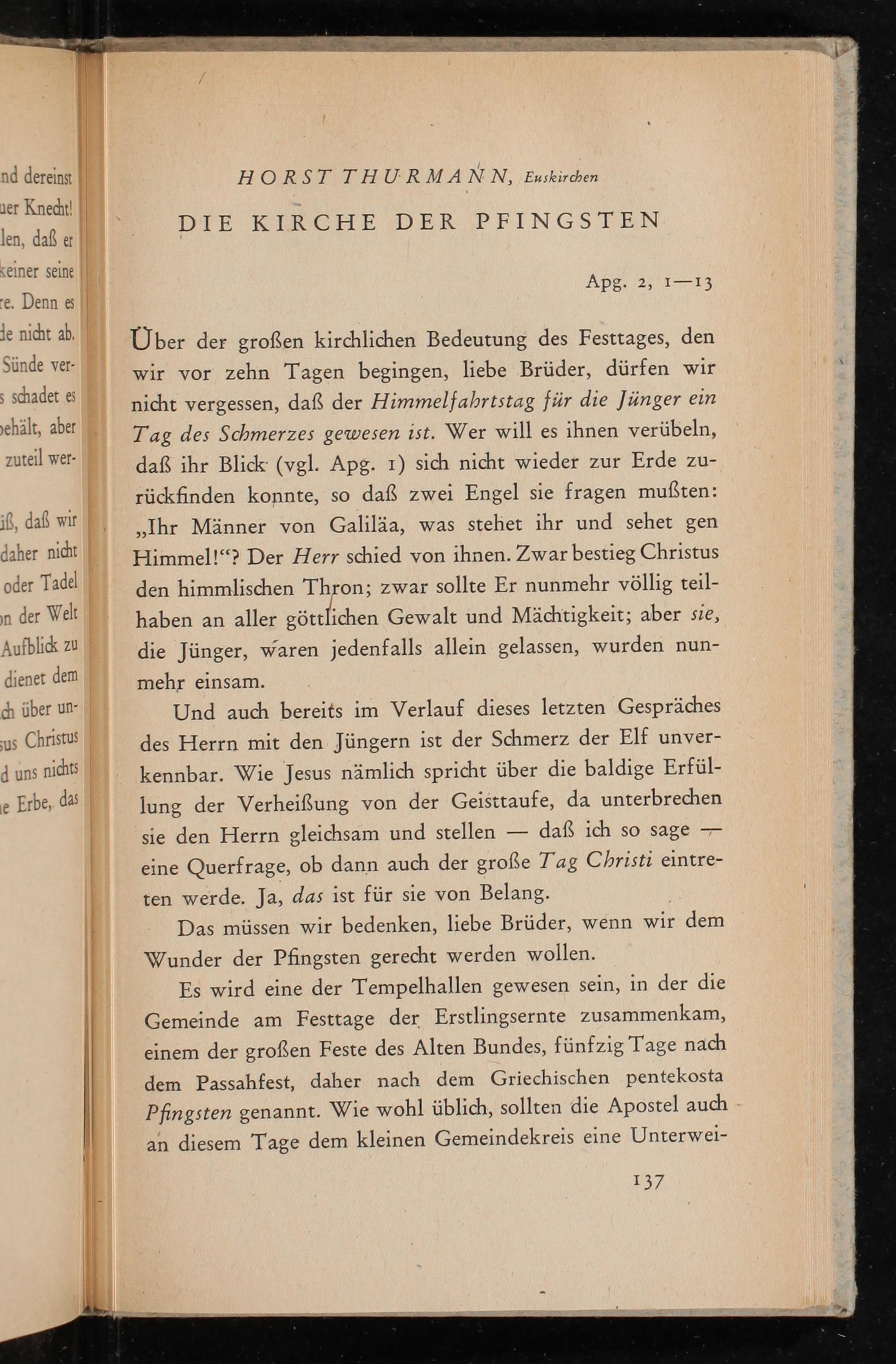 Über der großen kirchlichen Bedeutung des Festtages, den wir vor zehn Tagen begingen, liebe Brüder, dürfen wir nicht vergessen, daß der Himmelfahrtstag für die Jünger ein Tag des Schmerzes gewesen ist. Wer will es ihnen verübeln, daß ihr Blick( vgl. Apg. 1) sich nicht wieder zur Erde zurückfinden konnte, so daß zwei Engel sie fragen mußten: ,, Ihr Männer von Galiläa, was stehet ihr und sehet gen Himmel!"? Der Herr schied von ihnen. Zwar bestieg Christus den himmlischen Thron; zwar sollte Er nunmehr völlig teilhaben an aller göttlichen Gewalt und Mächtigkeit; aber sie, die Jünger, waren jedenfalls allein gelassen, wurden nunmehr einsam.