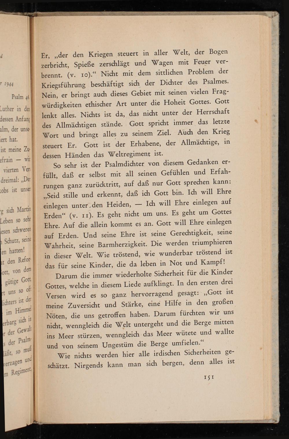 Er ,,, der den Kriegen steuert in aller Welt, der Bogen zerbricht, Spieße zerschlägt und Wagen mit Feuer verbrennt.( v. 10)." Nicht mit dem sittlichen Problem der Kriegsführung beschäftigt sich der Dichter des Psalmes. Nein, er bringt auch dieses Gebiet mit seinen vielen Fragwürdigkeiten ethischer Art unter die Hoheit Gottes. Gott lenkt alles. Nichts ist da, das nicht unter der Herrschaft des Allmächtigen stände. Gott spricht immer das letzte Wort und bringt alles zu seinem Ziel. Auch den Krieg steuert Er. Gott ist der Erhabene, der Allmächtige, in dessen Händen das Weltregiment ist.