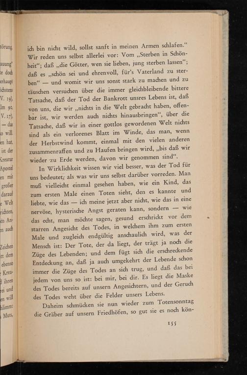 ich bin nicht wild, sollst sanft in meinen Armen schlafen." Wir reden uns selbst allerlei vor: Vom ,, Sterben in Schönheit"; daß ,, die Götter, wen sie lieben, jung sterben lassen"; daß es ,, schön sei und ehrenvoll, für's Vaterland zu sterben" und womit wir uns sonst stark zu machen und zu täuschen versuchen über die immer gleichbleibende bittere Tatsache, daß der Tod der Bankrott unsres Lebens ist, daß von uns, die wir ,, nichts in die Welt gebracht haben, offenbar ist, wir werden auch nichts hinausbringen", über die Tatsache, daß wir in einer gottlos gewordenen Welt nichts sind als ein verlorenes Blatt im Winde, das man, wenn der Herbstwind kommt, einmal mit den vielen anderen zusammenraffen und zu Haufen bringen wird ,,, bis daß wir wieder zu Erde werden, davon wir genommen sind".