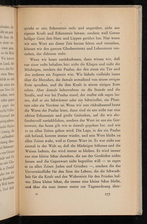 Wenn wir heute zurückschauen, dann wissen wir, daß nur einer recht behalten hat: nicht die Klugen und nicht die Mächtigen, sondern der Paulus, der den einen ein Tor und den anderen ein Ärgernis war. Wir lächeln vielleicht heute über die Menschen, die damals anmaßend von einem ewigen Rom sprachen, und die ihre Kraft in einem einigen Rom sahen. Aber damals beherrschten sie die Stunde und die Straße, und wer bei Paulus stand, der mußte sich sagen lassen, daß er ein Schwärmer oder ein Schwindler, ein Phantast oder ein Verräter sei. Wenn wir nun rückschauend heute die Worte des Paulus lesen, dann sind sie uns nicht nur eine schöne Erkenntnis und große Gedanken, auf die wir ehrfurchtsvoll zurückblicken, sondern das Wort ist uns ein Gotteswort, das heute gilt wie es damals gegolten hat, und wie es zu allen Zeiten gelten wird. Die Lage, in der ein Paulus sich befand, kommt immer wieder, und sein Wort bleibt zu allen Zeiten wahr, weil es Gottes Wort ist. Es war nicht nur einmal in der Welt so, daß die Mächtigen höhnten und die Weisen lachten, das wird immer so bleiben. Es wird immer nur eine kleine Schar dastehen, die aus der Geschichte nichts lernen und die Gegenwart nicht begreifen will so sagen es zu allen Zeiten Juden und Griechen, sondern die das Unverständliche für den Sinn des Lebens, die die Schwachheit für die Kraft und den Widerstreit für den Frieden halten. Diese kleine Schar, die immer eine kleine Schar bleibt, und über die man immer meint zur Tagesordnung über