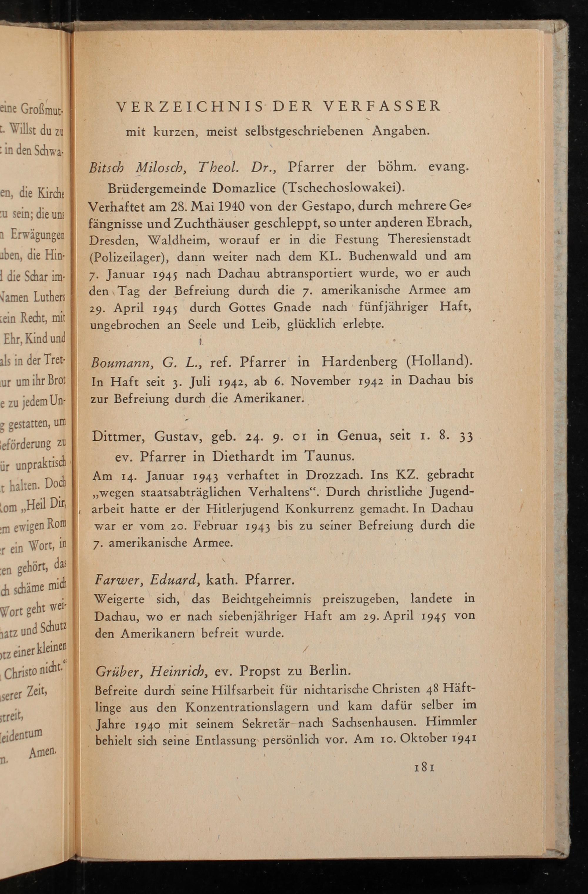 Bitsch Milosch, Theol. Dr., Pfarrer der böhm. evang. Brüdergemeinde Domazlice( Tschechoslowakei ). Verhaftet am 28. Mai 1940 von der Gestapo , durch mehrere Gefängnisse und Zuchthäuser geschleppt, so unter anderen Ebrach , Dresden, Waldheim, worauf er in die Festung Theresienstadt ( Polizeilager), dann weiter nach dem KL. Buchenwald und am 7. Januar 1945 nach Dachau abtransportiert wurde, wo er auch den Tag der Befreiung durch die 7. amerikanische Armee am 29. April 1945 durch Gottes Gnade nach fünfjähriger Haft, ungebrochen an Seele und Leib, glücklich erlebte.