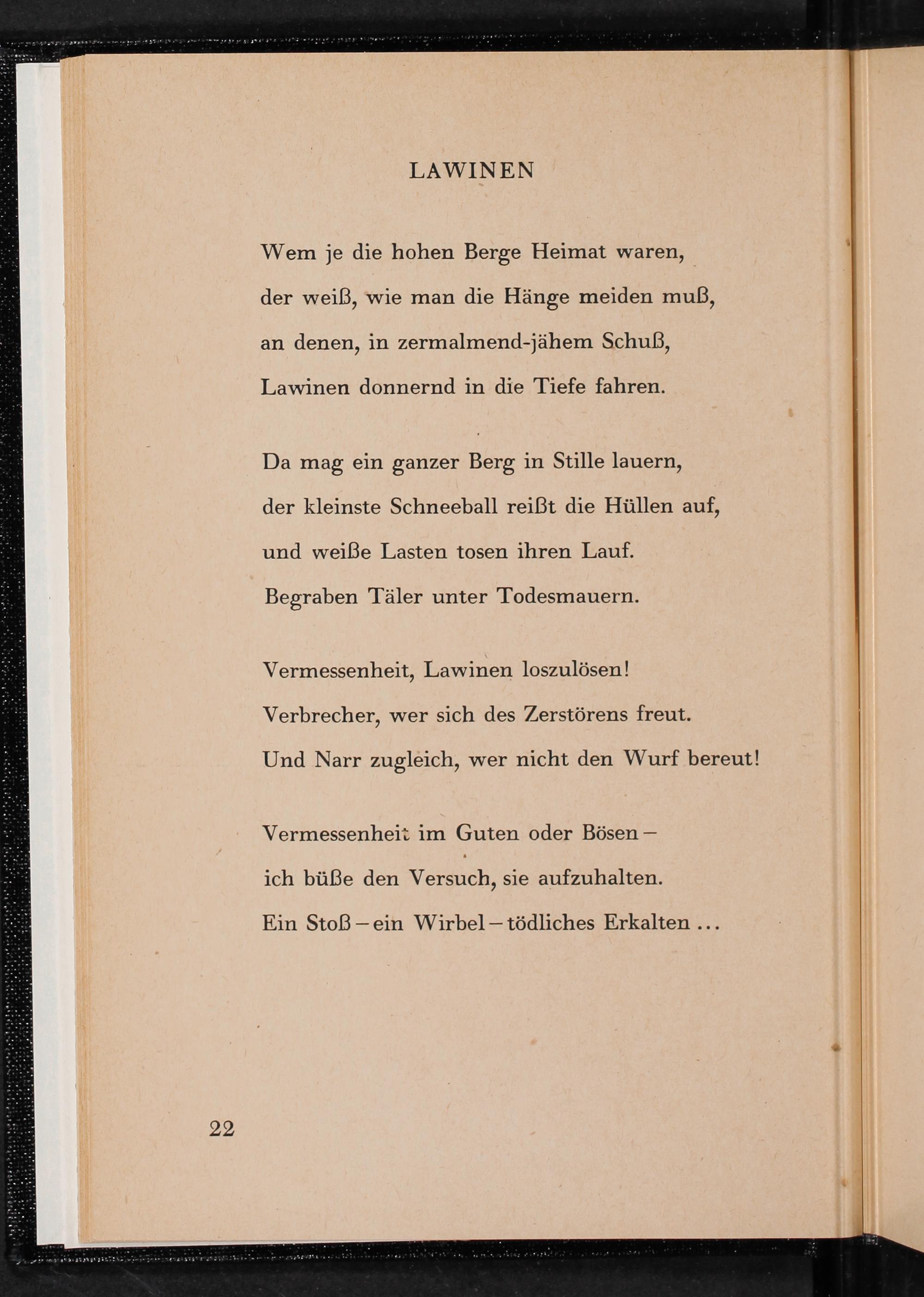 Wem je die hohen Berge Heimat waren,\ der weiß, wie man die Hänge meiden muß, an denen, in zermalmend-jähem Schuß,