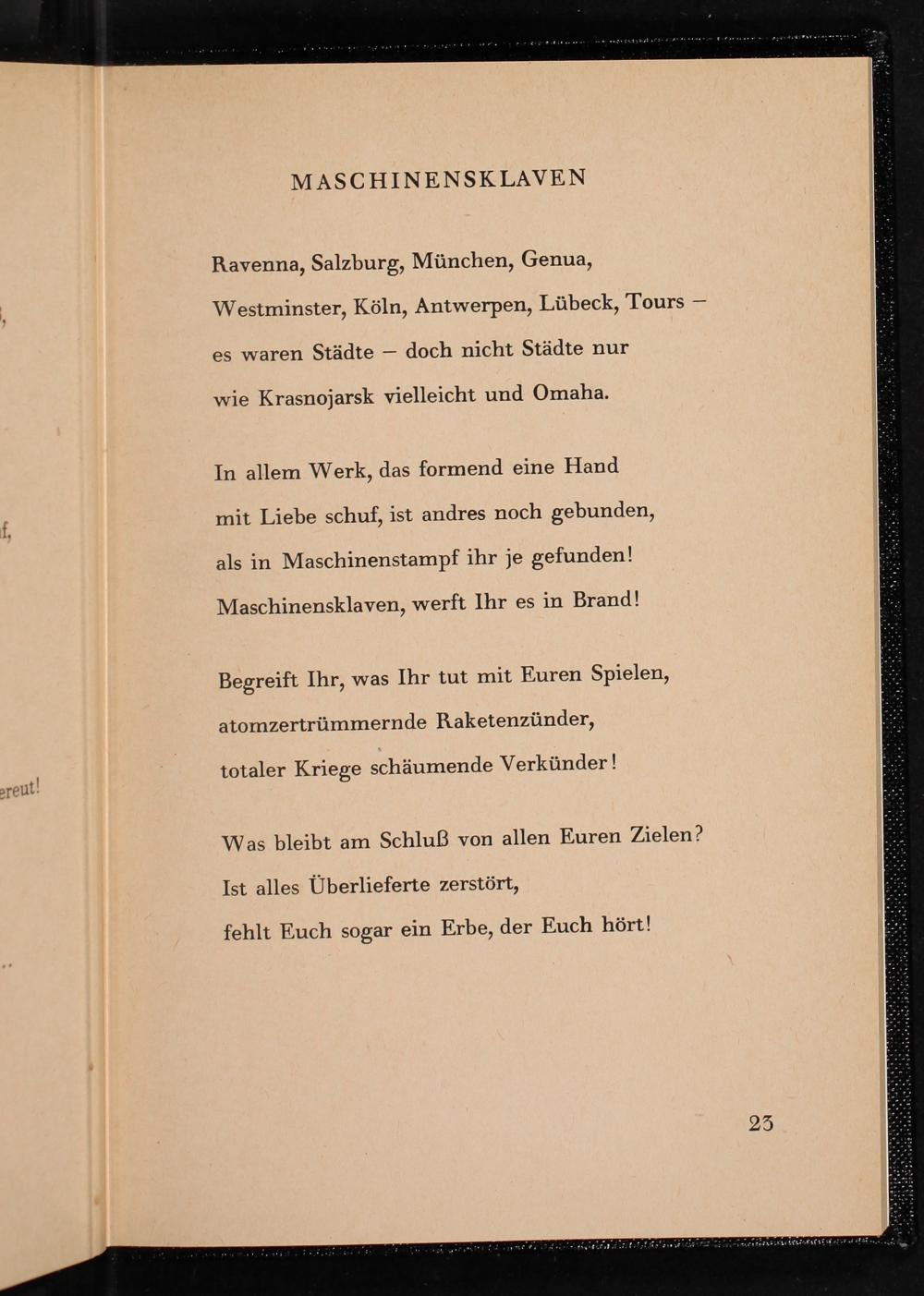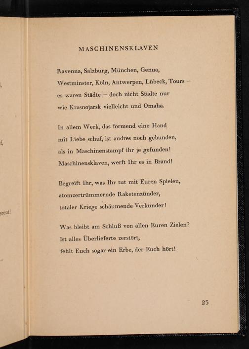 In allem Werk, das formend eine Hand mit Liebe schuf, ist andres noch gebunden, als in Maschinenstampf ihr je gefunden! Maschinensklaven, werft Ihr es in Brand!