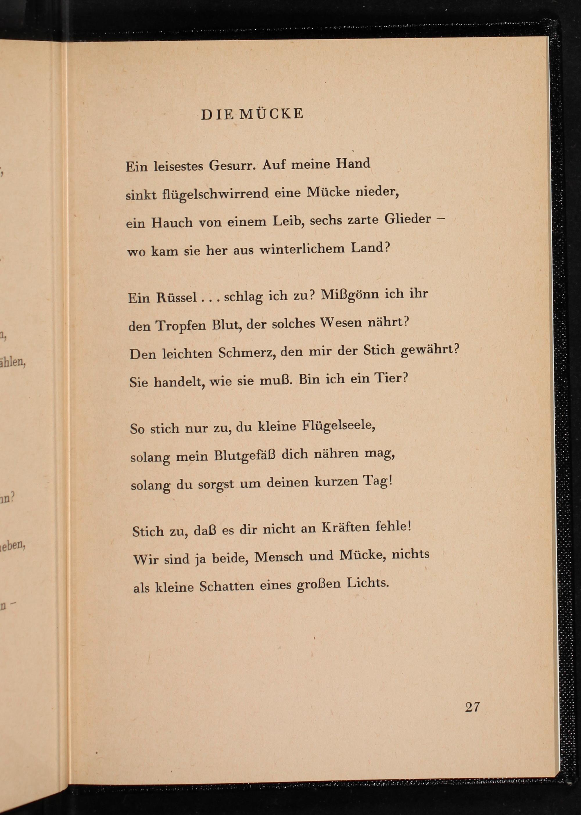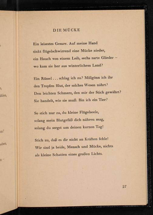 Ein leisestes Gesurr. Auf meine Hand sinkt flügelschwirrend eine Mücke nieder, ein Hauch von einem Leib, sechs zarte Glieder—