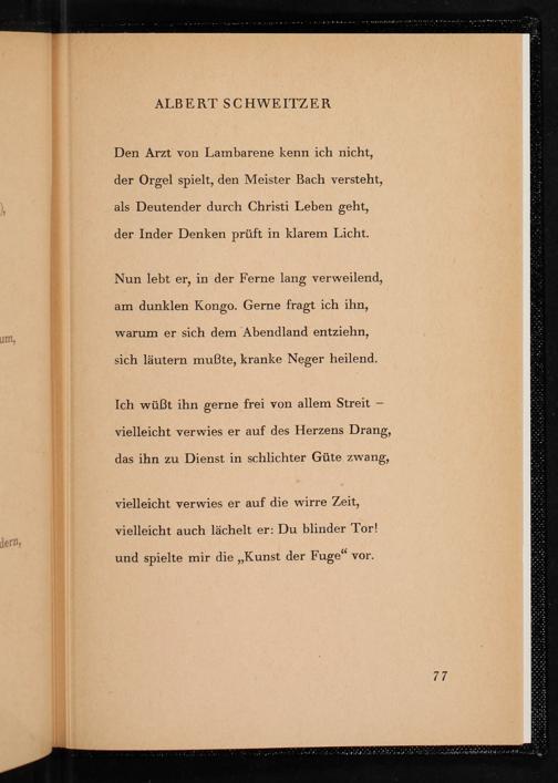 Den Arzt von Lambarene kenn ich nicht, der Orgel spielt, den Meister Bach versteht, als Deutender durch Christi Leben geht,