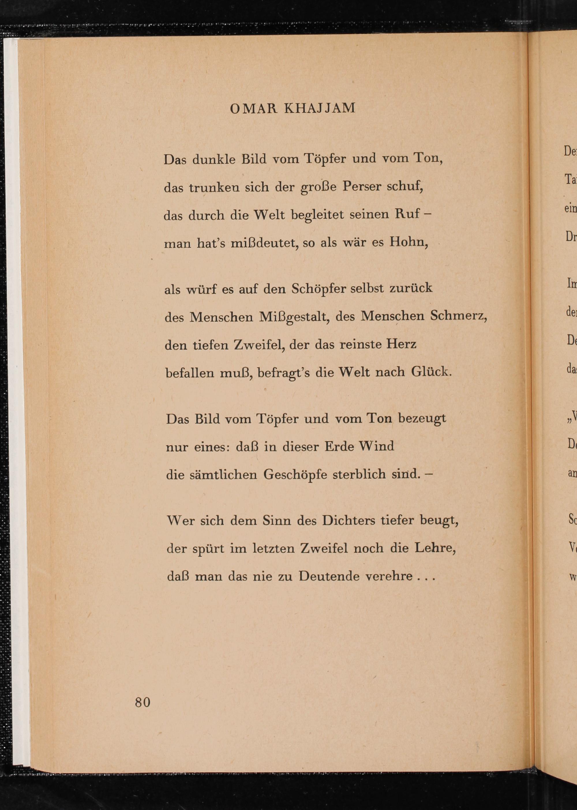 Das dunkle Bild vom Töpfer und vom Ton, das trunken sich der große Perser schuf, das durch die Welt begleitet seinen Ruf—