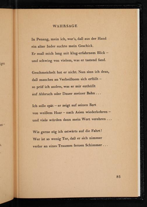 In Penang, mein ich, war's, daß aus der Hand ein alter Inder suchte mein Geschick. Er maß mich lang mit klug-erfahrnem Blick—