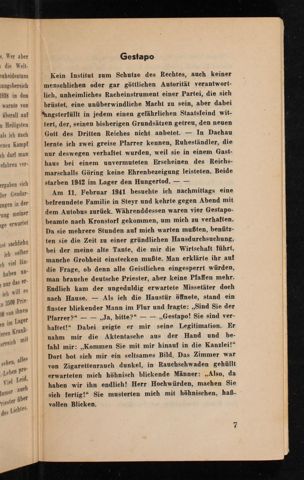 Kein Institut zum Schutze des Rechtes, auch keiner menschlichen oder gar göttlichen Autorität verantwortlich, unheimliches Racheinstrument einer Partei, die sich brüstet, eine unüberwindliche Macht zu sein, aber dabei angsterfüllt in jedem einen gefährlichen Staatsfeind wittert, der, seinen bisherigen Grundsätzen getreu, den neuen In Dachau Gott des Dritten Reiches nicht anbetet. lernte ich zwei greise Pfarrer kennen, Ruheständler, die nur deswegen verhaftet wurden, weil sie in einem Gasthaus bei einem unvermuteten Erscheinen des Reichsmarschalls Göring keine Ehrenbezeigung leisteten. Beide starben 1942 im Lager den Hungertod.