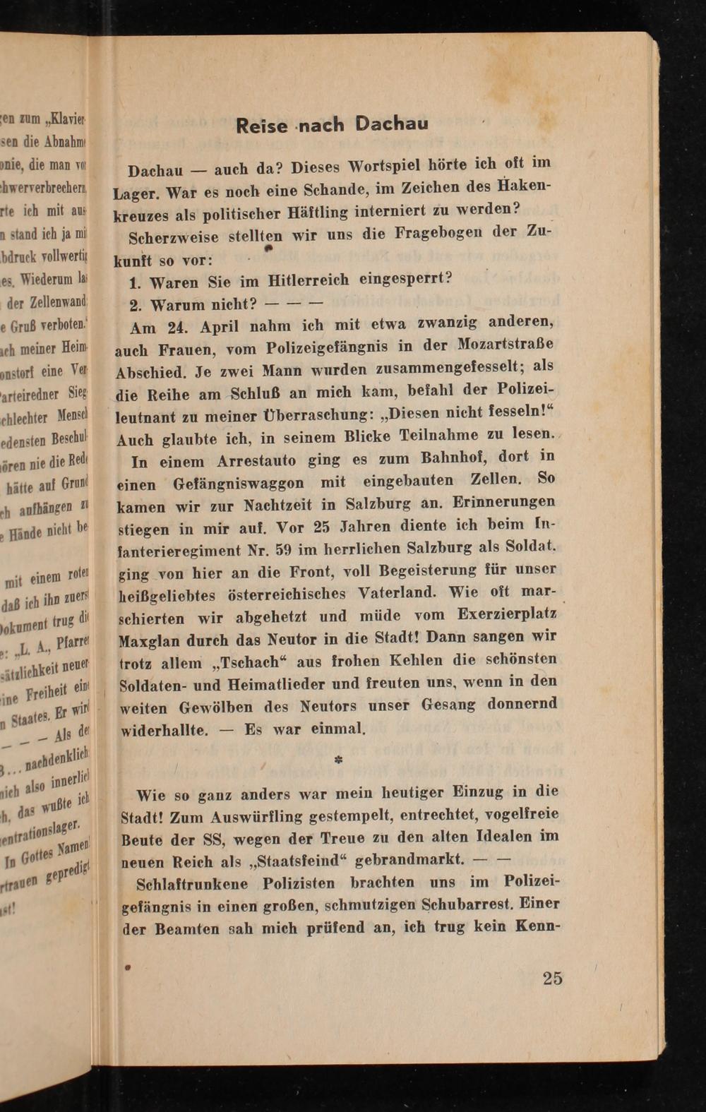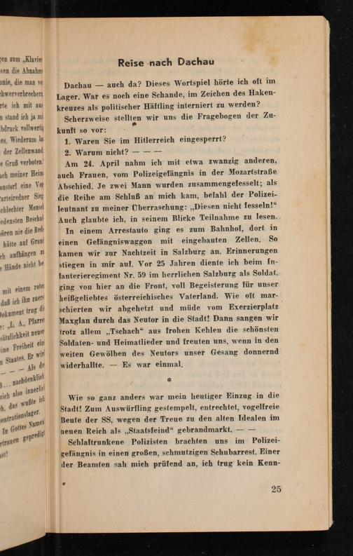 In einem Arrestauto ging es zum Bahnhof, dort in einen Gefängniswaggon mit eingebauten Zellen. So kamen wir zur Nachtzeit in Salzburg an. Erinnerungen stiegen in mir auf. Vor 25 Jahren diente ich beim Infanterieregiment Nr. 59 im herrlichen Salzburg als Soldat, ging von hier an die Front, voll Begeisterung für unser heißgeliebtes österreichisches Vaterland. Wie oft marschierten wir abgehetzt und müde vom Exerzierplatz Maxglan durch das Neutor in die Stadt! Dann sangen wir trotz allem ,, Tschach" aus frohen Kehlen die schönsten Soldaten- und Heimatlieder und freuten uns, wenn in den weiten Gewölben des Neutors unser Gesang donnernd widerhallte. Es war einmal.
