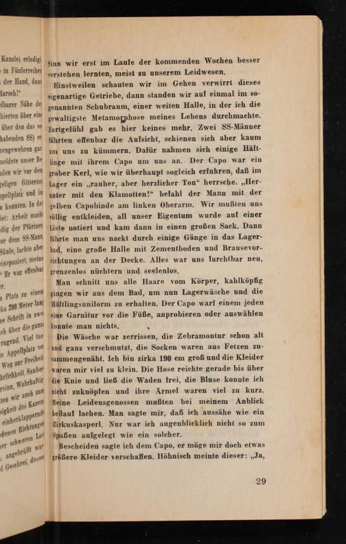 Einstweilen schauten wir im Gehen verwirrt dieses eigenartige Getriebe, dann standen wir auf einmal im sogenannten Schubraum, einer weiten Halle, in der ich die gewaltigste Metamorphose meines Lebens durchmachte. Zartgefühl gab es hier keines mehr. Zwei SS - Männer führten offenbar die Aufsicht, schienen sich aber kaum um uns zu kümmern. Dafür nahmen sich einige Häftlinge mit ihrem Capo um uns an. Der Capo war ein grober Kerl, wie wir überhaupt sogleich erfuhren, daß im Lager ein ,, rauher, aber herzlicher Ton" herrsche. ,, Herunter mit den Klamotten!" befahl der Mann mit der gelben Capobinde am linken Oberarm. Wir mußten uns völlig entkleiden, all unser Eigentum wurde auf einer Liste notiert und kam dann in einen großen Sack. Dann führte man uns nackt durch einige Gänge in das Lagerbad, eine große Halle mit Zementboden und Brausevorrichtungen an der Decke. Alles war uns furchtbar neu, grenzenlos nüchtern und seelenlos.