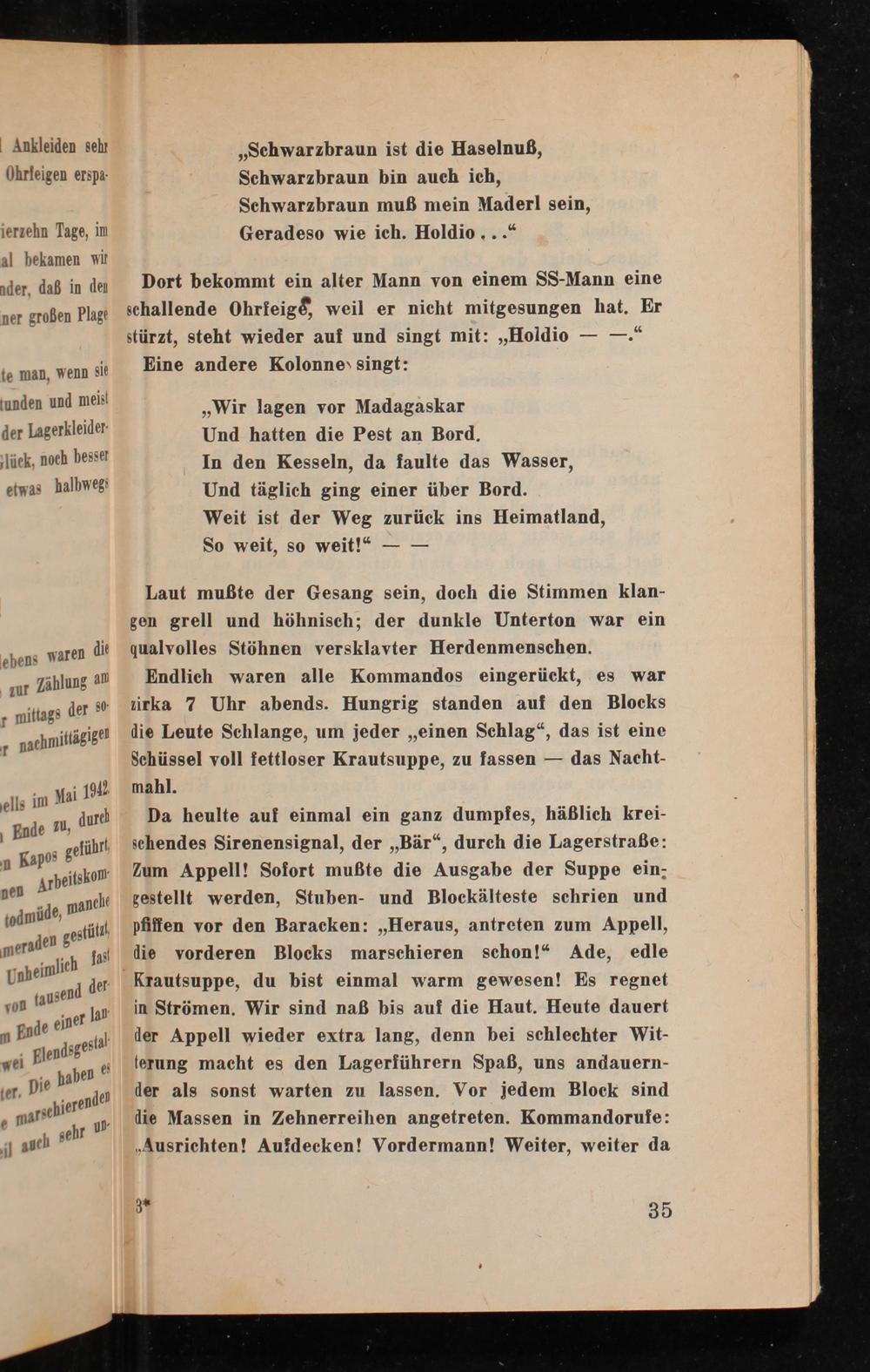 Dort bekommt ein alter Mann von einem SS- Mann eine schallende Ohrfeige, weil er nicht mitgesungen hat. Er stürzt, steht wieder auf und singt mit: ,, Holdio--." Eine andere Kolonne singt: