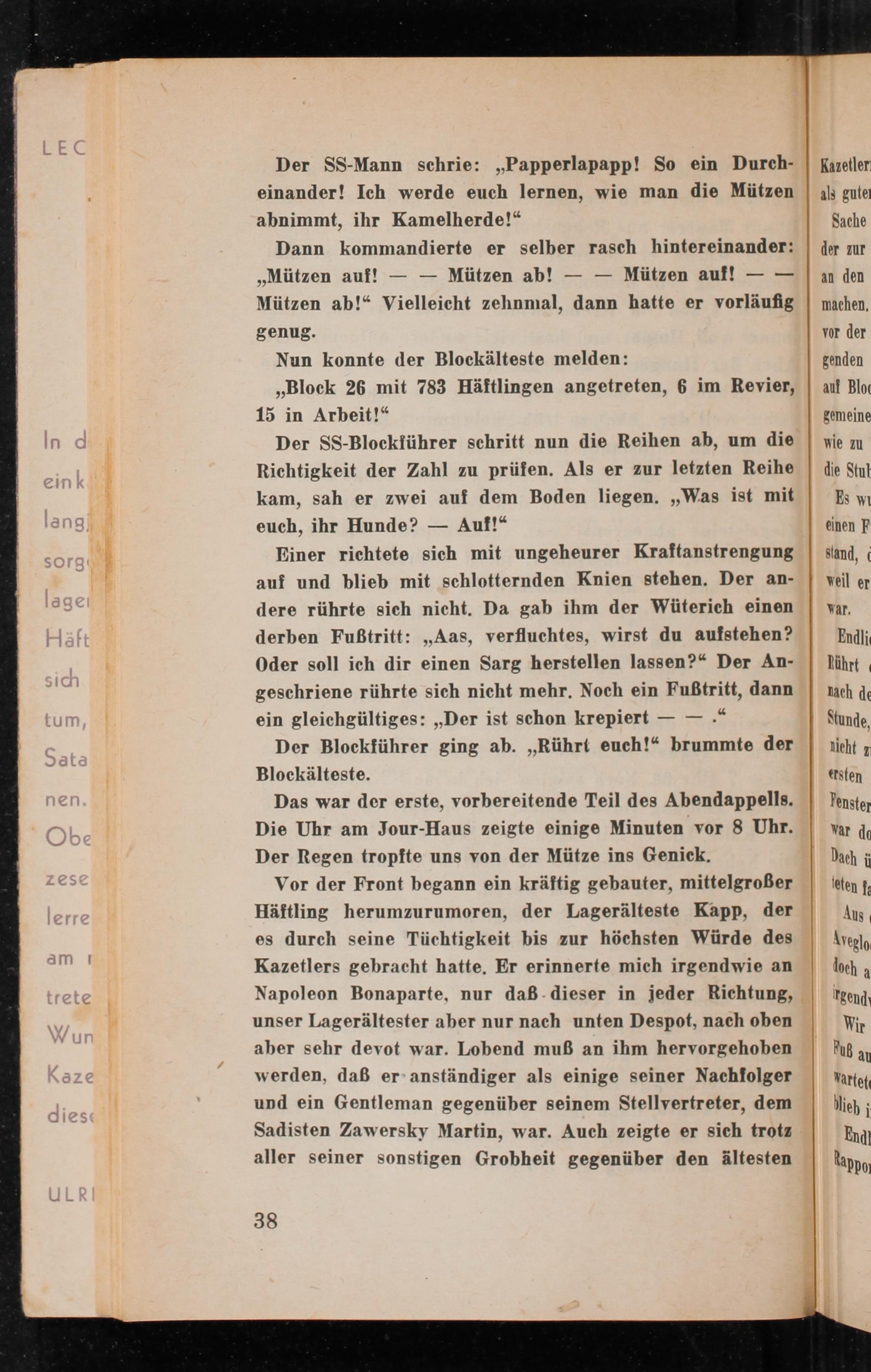 Vor der Front begann ein kräftig gebauter, mittelgroßer Häftling herumzurumoren, der Lagerälteste Kapp, der es durch seine Tüchtigkeit bis zur höchsten Würde des Kazetlers gebracht hatte, Er erinnerte mich irgendwie an