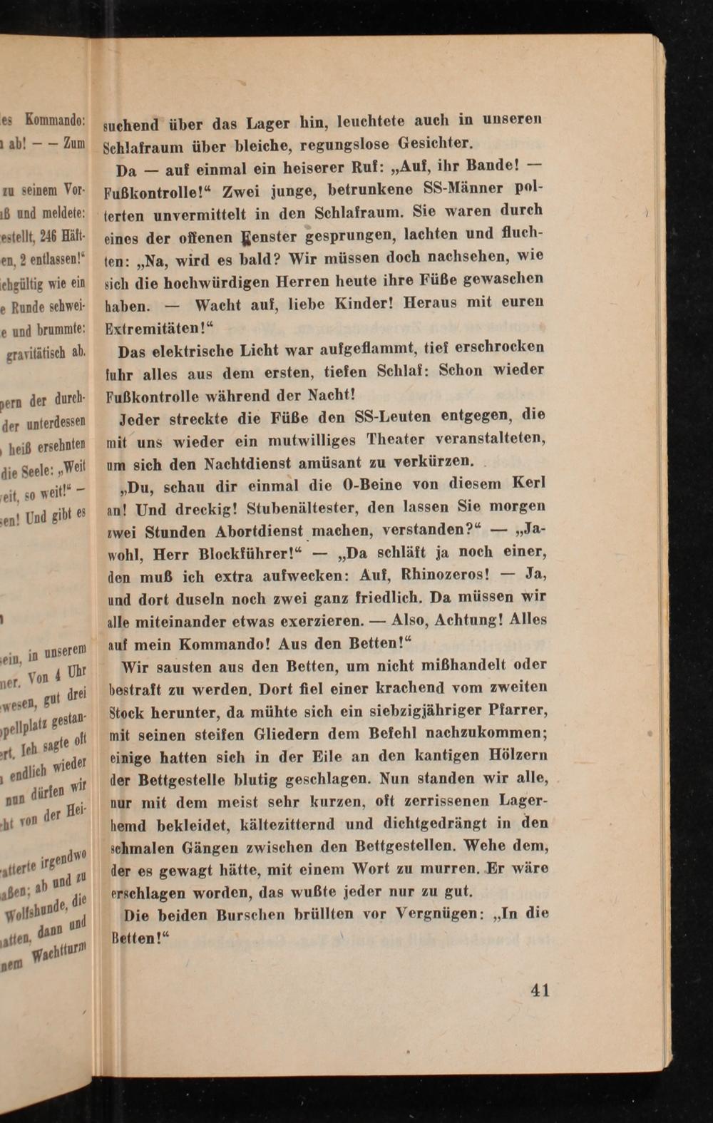 Wir sausten aus den Betten, um nicht mißhandelt oder bestraft zu werden. Dort fiel einer krachend vom zweiten Stock herunter, da mühte sich ein siebzigjähriger Pfarrer, mit seinen steifen Gliedern dem Befehl nachzukommen; einige hatten sich in der Eile an den kantigen Hölzern der Bettgestelle blutig geschlagen. Nun standen wir alle, nur mit dem meist sehr kurzen, oft zerrissenen Lagerhemd bekleidet, kältezitternd und dichtgedrängt in den schmalen Gängen zwischen den Bettgestellen. Wehe dem, der es gewagt hätte, mit einem Wort zu murren. Er wäre erschlagen worden, das wußte jeder nur zu gut. Die beiden Burschen brüllten vor Vergnügen: ,, In die Betten!"