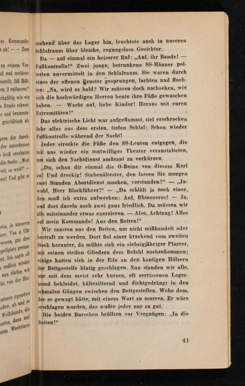 Da auf einmal ein heiserer Ruf: ,, Auf, ihr Bande! Fußkontrolle!" Zwei junge, betrunkene SS- Männer polterten unvermittelt in den Schlafraum. Sie waren durch eines der offenen Fenster gesprungen, lachten und fluchten: ,, Na, wird es bald? Wir müssen doch nachsehen, wie sich die hochwürdigen Herren heute ihre Füße gewaschen Wacht auf, liebe Kinder! Heraus mit euren