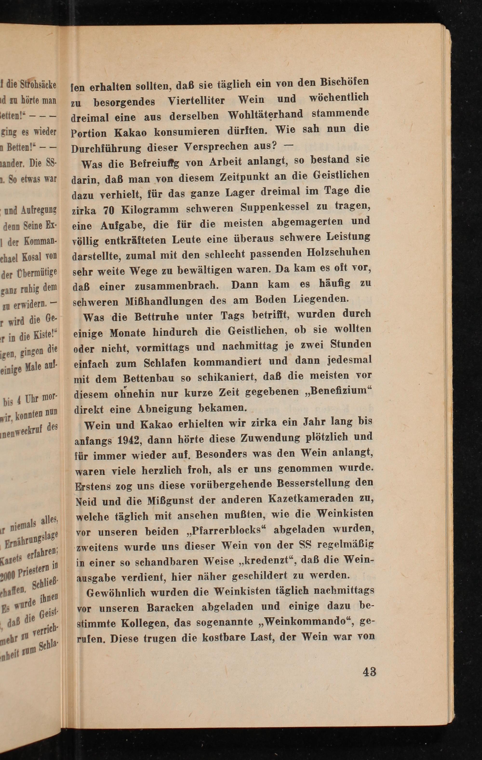 Was die Befreiung von Arbeit anlangt, so bestand sie darin, daß man von diesem Zeitpunkt an die Geistlichen dazu verhielt, für das ganze Lager dreimal im Tage die zirka 70 Kilogramm schweren Suppenkessel zu tragen, eine Aufgabe, die für die meisten abgemagerten und völlig entkräfteten Leute eine überaus schwere Leistung darstellte, zumal mit den schlecht passenden Holzschuhen sehr weite Wege zu bewältigen waren. Da kam es oft vor, daß einer zusammenbrach. Dann kam es häufig zu schweren Miẞhandlungen des am Boden Liegenden. Was die Bettruhe unter Tags betrifft, wurden durch einige Monate hindurch die Geistlichen, ob sie wollten oder nicht, vormittags und nachmittag je zwei Stunden einfach zum Schlafen kommandiert und dann jedesmal mit dem Bettenbau so schikaniert, daß die meisten vor diesem ohnehin nur kurze Zeit gegebenen ,, Benefizium" direkt eine Abneigung bekamen.