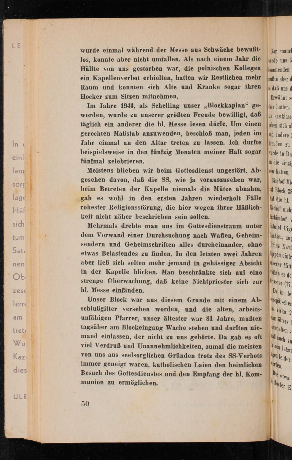 Meistens blieben wir beim Gottesdienst ungestört. Abgesehen davon, daß die SS, wie ja vorauszusehen war, beim Betreten der Kapelle niemals die Mütze abnahm, gab es wohl in den ersten Jahren wiederholt Fälle rohester Religionsstörung, die hier wegen ihrer Häßlichkeit nicht näher beschrieben sein sollen.