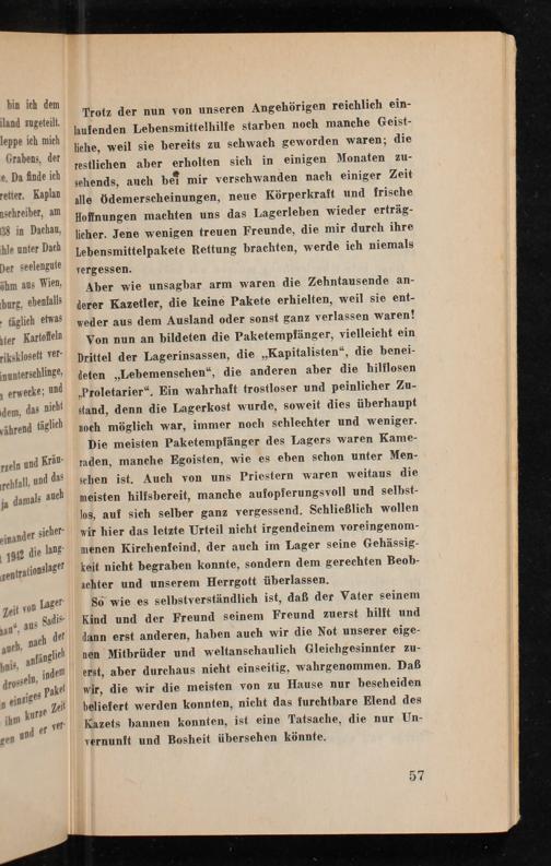 Die meisten Paketempfänger des Lagers waren Kameraden, manche Egoisten, wie es eben schon unter Menschen ist. Auch von uns Priestern waren weitaus die meisten hilfsbereit, manche aufopferungsvoll und selbstlos, auf sich selber ganz vergessend. Schließlich wollen wir hier das letzte Urteil nicht irgendeinem voreingenommenen Kirchenfeind, der auch im Lager seine Gehässigkeit nicht begraben konnte, sondern dem gerechten Beobachter und unserem Herrgott überlassen.