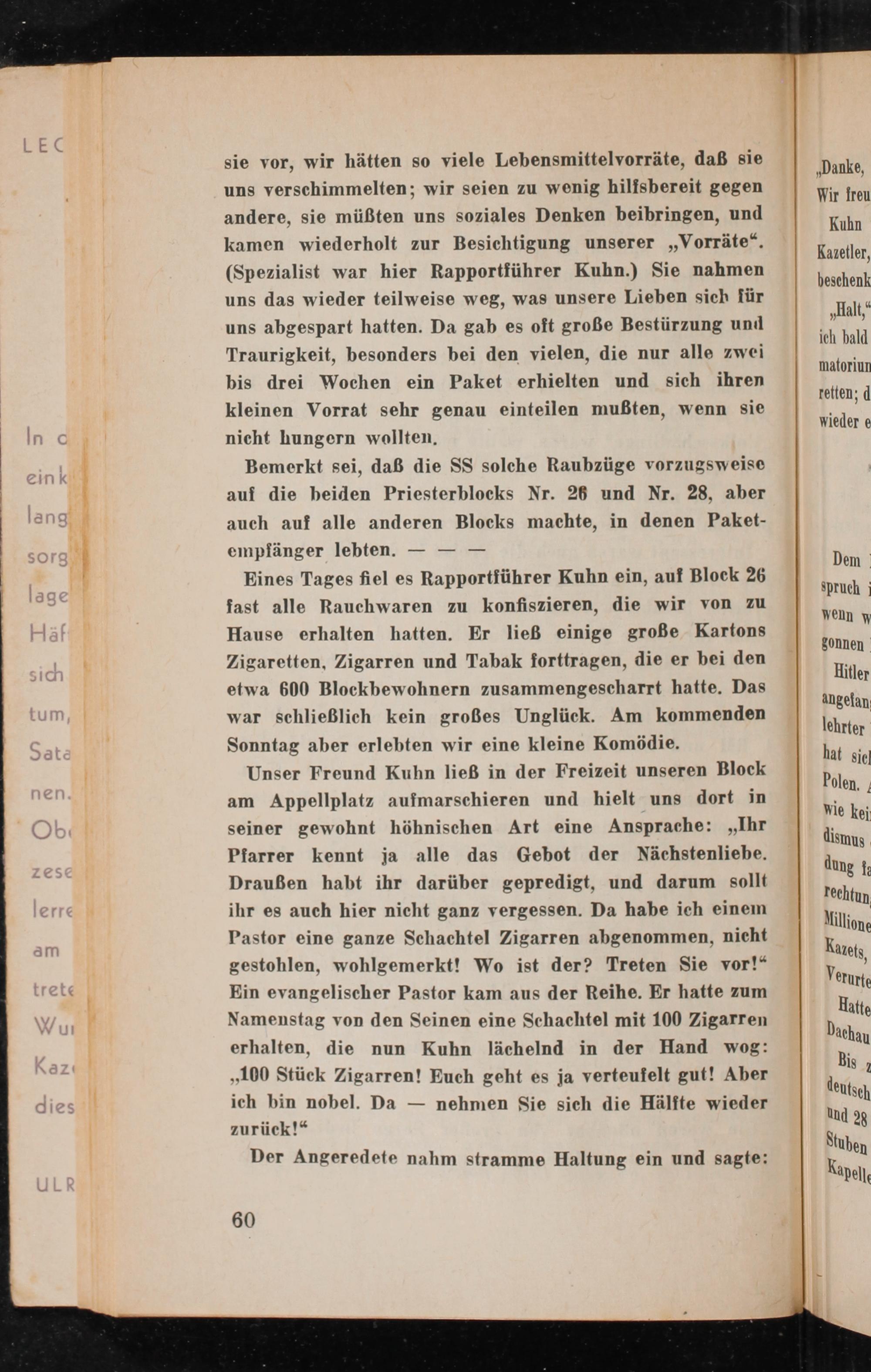 Unser Freund Kuhn ließ in der Freizeit unseren Block am Appellplatz aufmarschieren und hielt uns dort in seiner gewohnt höhnischen Art eine Ansprache:„Ihr Pfarrer kennt ja alle das Gebot der Nächstenliebe. Draußen habt ihr darüber gepredigt, und darum sollt ihr es auch hier nicht ganz vergessen. Da habe ich einem Pastor eine ganze Schachtel Zigarren abgenommen, nicht gestohlen, wohlgemerkt! Wo ist der? Treten Sie vor!“ Ein evangelischer Pastor kam aus der Reihe. Er hatte zum Namenstag von den Seinen eine Schachtel mit 100 Zigarren erhalten, die nun Kuhn lächelnd in der Hand wog: „100 Stück Zigarren! Euch geht es ja verteufelt gut! Aber ich bin nobel. Da— nehmen Sie sich die Hälfte wieder zurück!“
