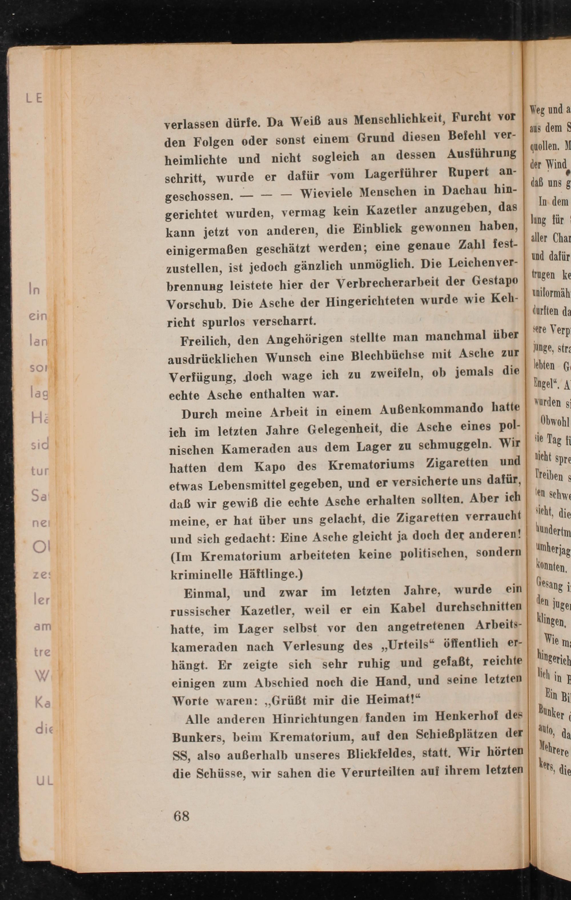 verlassen dürfe. Da Weiß aus Menschlichkeit, Furcht vor den Folgen oder sonst einem Grund diesen Befehl verheimlichte und nicht sogleich an dessen Ausführung schritt, wurde er dafür vom Lagerführer Rupert angeschossen. Wieviele Menschen in Dachau hingerichtet wurden, vermag kein Kazetler anzugeben, das kann jetzt von anderen, die Einblick gewonnen haben, einigermaßen geschätzt werden; eine genaue Zahl festzustellen, ist jedoch gänzlich unmöglich. Die Leichenverbrennung leistete hier der Verbrecherarbeit der Gestapo Vorschub. Die Asche der Hingerichteten wurde wie Kehricht spurlos verscharrt.