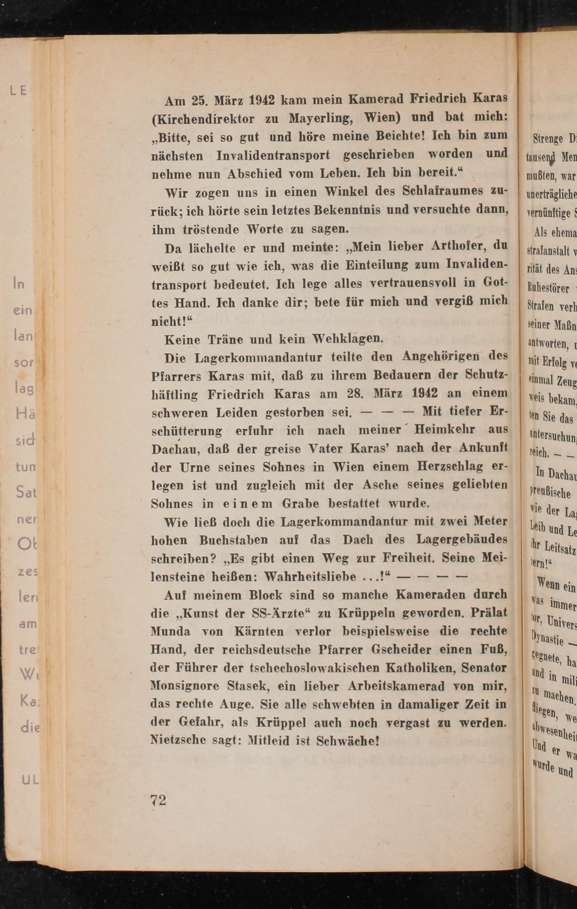 Auf meinem Block sind so manche Kameraden durch die ,, Kunst der SS- Ärzte" zu Krüppeln geworden. Prälat Munda von Kärnten verlor beispielsweise die rechte Hand, der reichsdeutsche Pfarrer Gscheider einen Fuß, der Führer der tschechoslowakischen Katholiken, Senator Monsignore Stasek, ein lieber Arbeitskamerad von mir, das rechte Auge. Sie alle schwebten in damaliger Zeit in der Gefahr, als Krüppel auch noch vergast zu werden. Nietzsche sagt: Mitleid ist Schwäche!