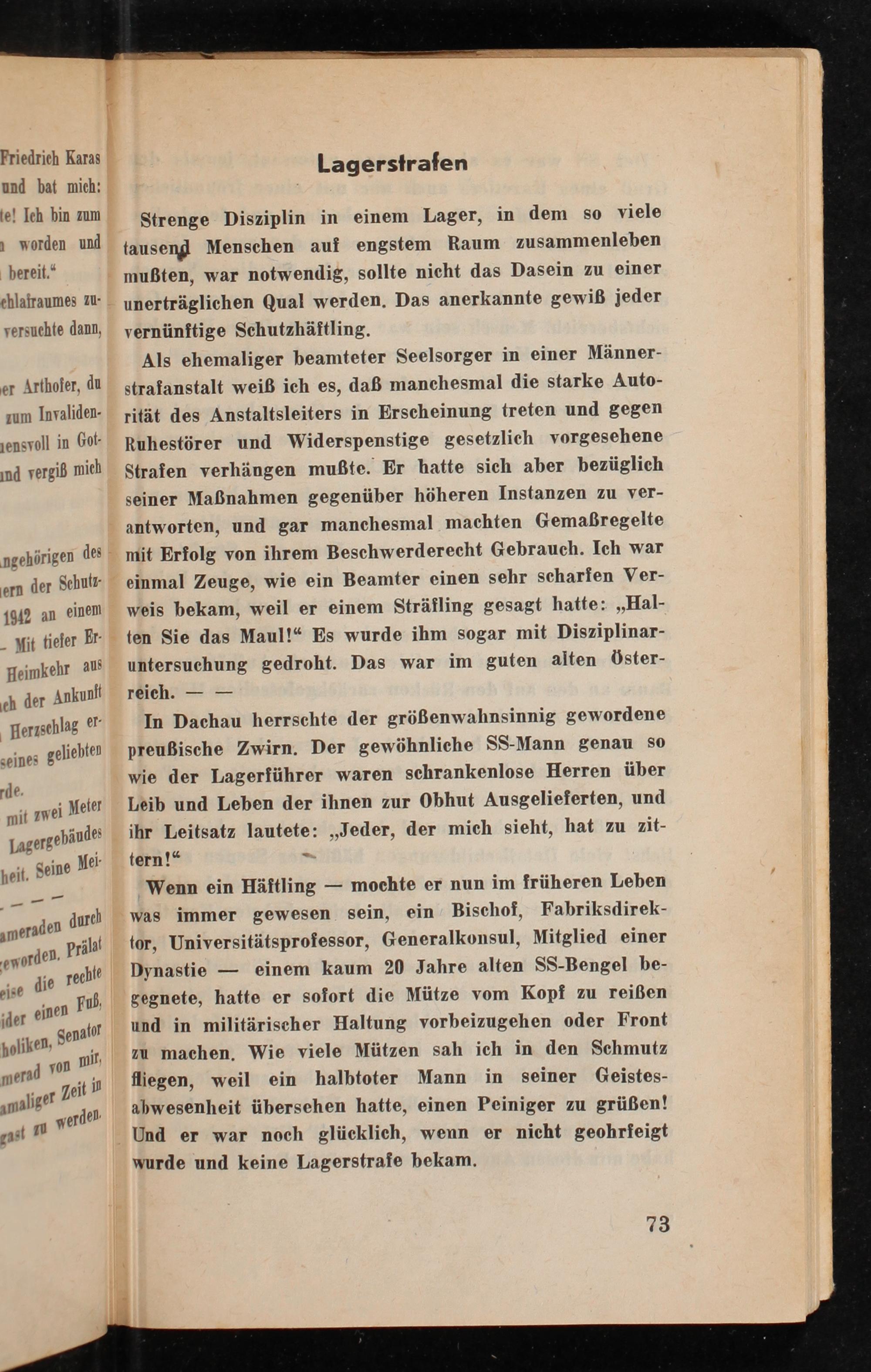 Als ehemaliger beamteter Seelsorger in einer Männerstrafanstalt weiß ich es, daß manchesmal die starke Autorität des Anstaltsleiters in Erscheinung treten und gegen Ruhestörer und Widerspenstige gesetzlich vorgesehene Strafen verhängen mußte. Er hatte sich aber bezüglich seiner Maßnahmen gegenüber höheren Instanzen zu verantworten, und gar manchesmal machten Gemaßregelte mit Erfolg von ihrem Beschwerder echt Gebrauch. Ich war einmal Zeuge, wie ein Beamter einen sehr scharfen Verweis bekam, weil er einem Sträfling gesagt hatte: ,, Halten Sie das Maul!" Es wurde ihm sogar mit Disziplinaruntersuchung gedroht. Das war im guten alten Öster