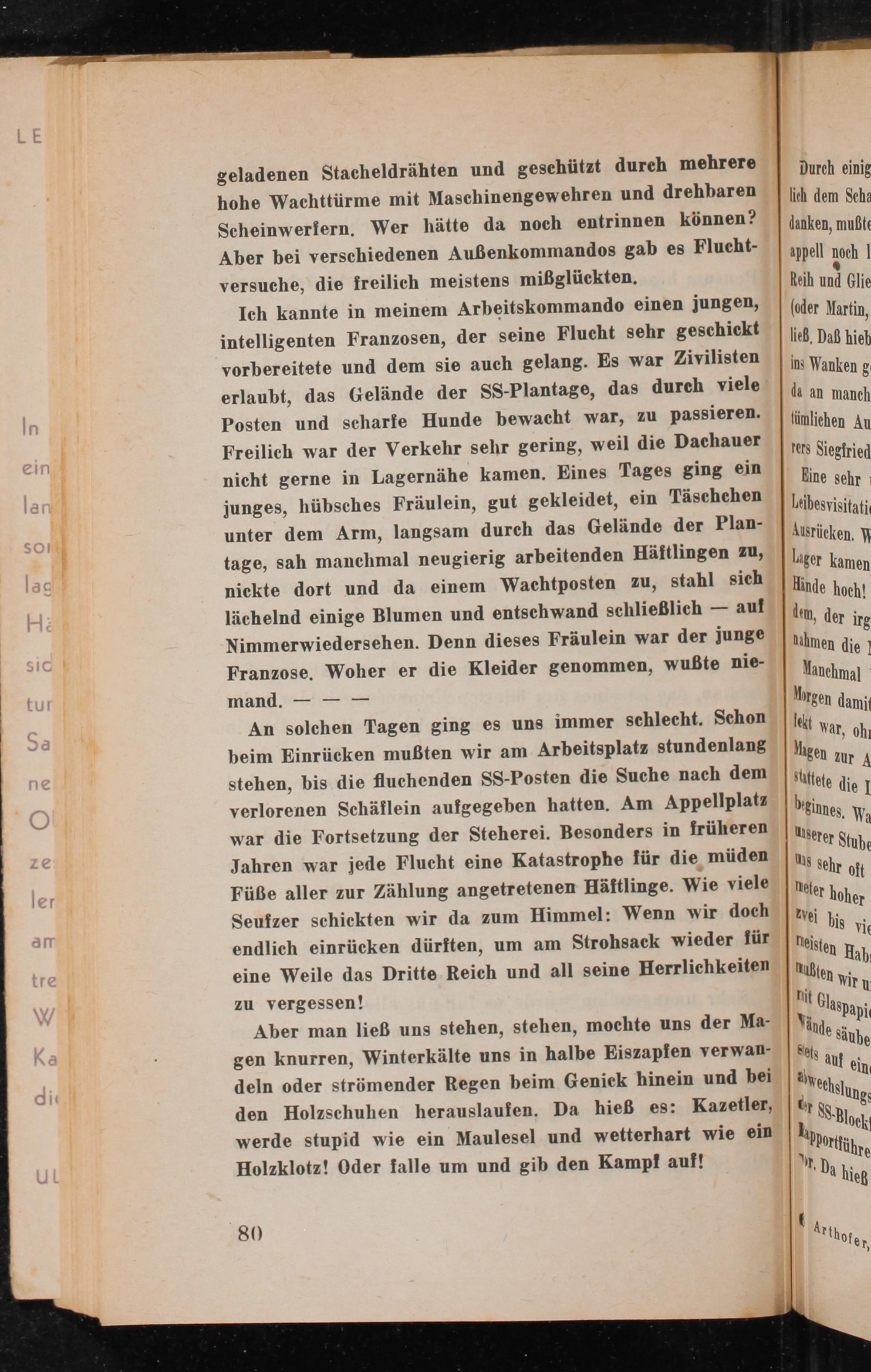 An solchen Tagen ging es uns immer schlecht. Schon beim Einrücken mußten wir am Arbeitsplatz stundenlang stehen, bis die fluchenden SS-Posten die Suche nach dem verlorenen Schäflein aufgegeben hatten. Am Appellplatz war die Fortsetzung der Steherei. Besonders in früheren Jahren war jede Flucht eine Katastrophe für die, müden Füße aller zur Zählung angetretenen Häftlinge. Wie viele Seufzer schiekten wir da zum Himmel: Wenn wir doch endlich einrücken dürften, um am Strohsack wieder für eine Weile das Dritte Reich und all seine Herrlichkeiten zu vergessen! l