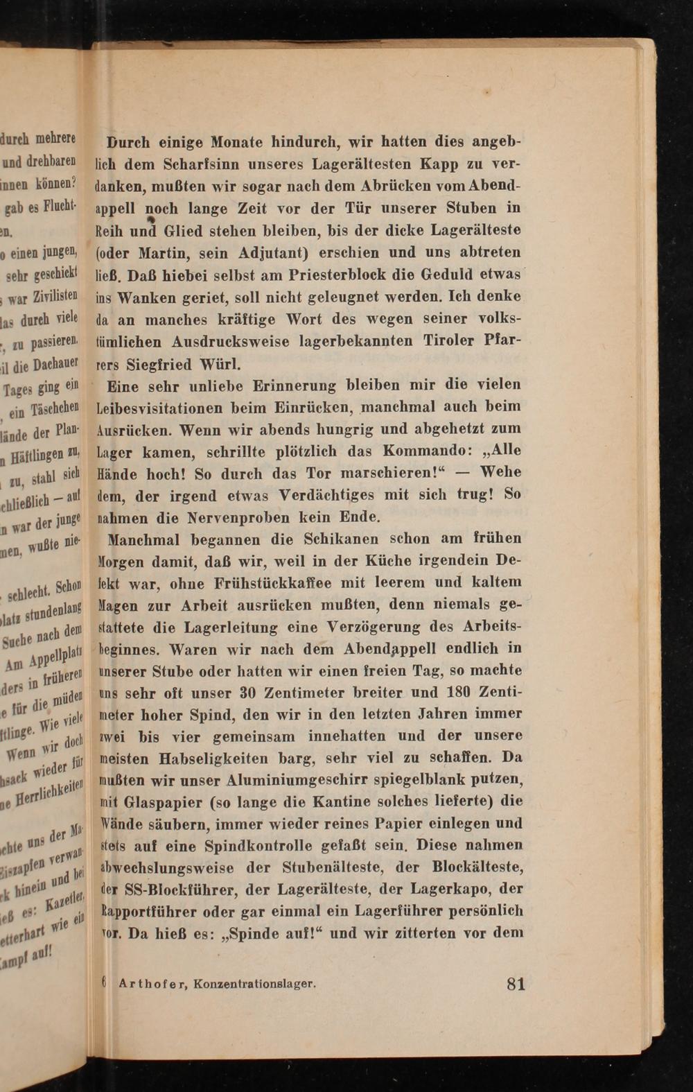 Durch einige Monate hindurch, wir hatten dies angeblich dem Scharfsinn unseres Lagerältesten Kapp zu verdanken, mußten wir sogar nach dem Abrücken vom Abendappell noch lange Zeit vor der Tür unserer Stuben in Reih und Glied stehen bleiben, bis der dicke Lagerälteste ( oder Martin, sein Adjutant) erschien und uns abtreten ließ. Daß hiebei selbst am Priesterblock die Geduld etwas ins Wanken geriet, soll nicht geleugnet werden. Ich denke da an manches kräftige Wort des wegen seiner volkstümlichen Ausdrucksweise lagerbekannten Tiroler Pfarrers Siegfried Würl.